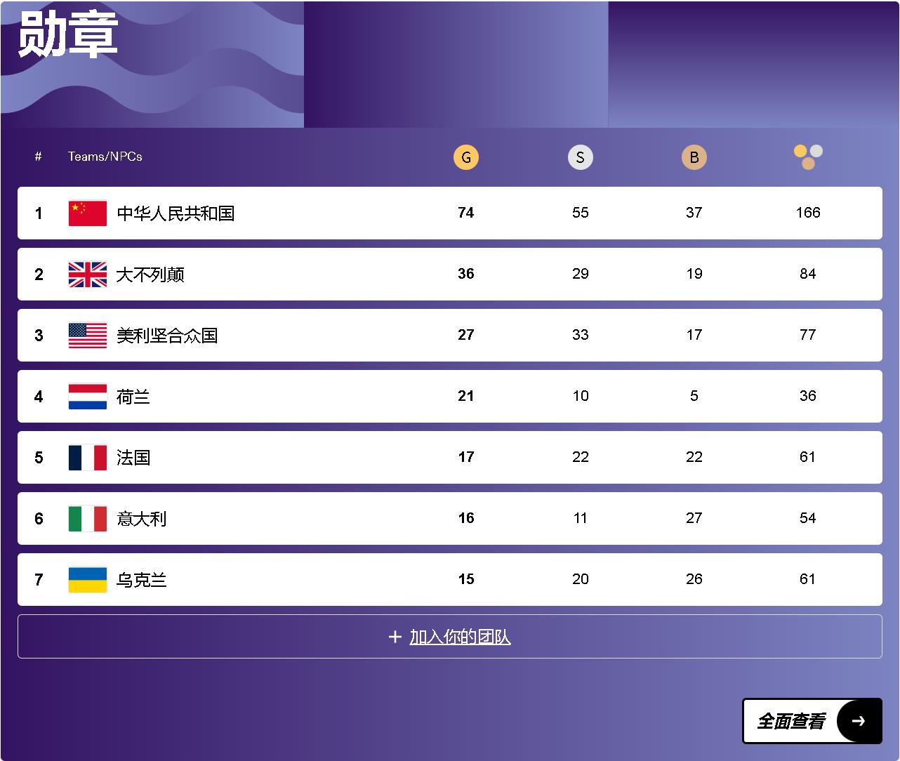 目前中国代表团以74金55银37铜继续领跑金牌榜,英国队、美国队分列二、三位。
