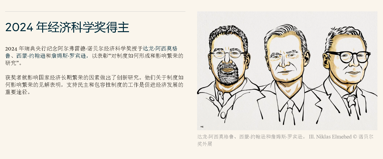 达龙·阿西莫格鲁、西蒙·约翰逊和詹姆斯·罗宾逊就影响国家经济长期繁荣的因素做出了创新研究。他们的实证研究证明了殖民时期引入的政治和经济制度类型的根本重要性。他们的理论研究有助于我们理解为什么改革榨取式制度如此困难,同时也指出了这种情况仍然可能发生的一些情况。获奖者的工作对经济学和政治学的持续研究产生了决定性影响。他们关于制度如何影响繁荣的见解表明,支持民主和包容性制度的工作是促进经济发展的重要途径。