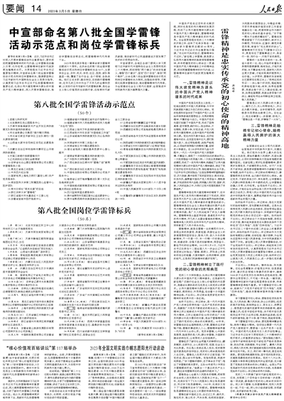 新华社北京3月4日电 近日,习近平总书记对深入开展学雷锋活动作出重要指示,要求深刻把握雷锋精神的时代内涵,让学雷锋活动融入日常、化作经常,让雷锋精神在新时代绽放更加璀璨的光芒。为贯彻落实习近平总书记重要指示精神,中宣部命名第八批全国学雷锋活动示范点和岗位学雷锋标兵,强调要坚持以习近平新时代中国特色社会主义思想为指导,认真贯彻习近平总书记关于弘扬雷锋精神的重要论述,弘扬以伟大建党精神为源头的中国共产党人精神谱系,深入开展学雷锋活动,推动学雷锋活动常态化,把雷锋精神代代传承下去。