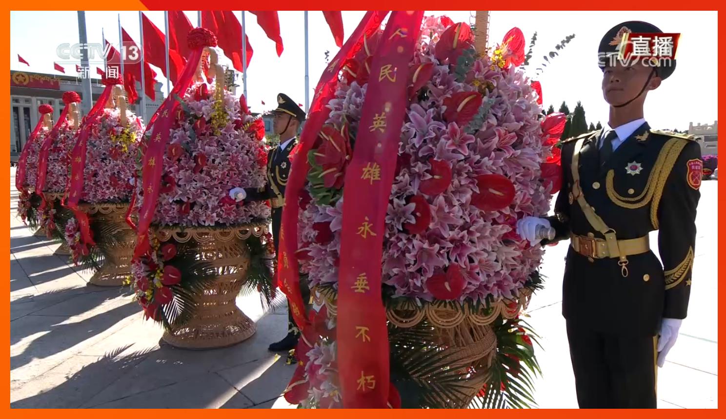 方阵前,以中共中央,全国人大常委会,国务院,全国政协,中央军委,各民主党派、全国工商联和无党派爱国人士,各人民团体和各界群众,老战士、老同志和烈士亲属,中国少年先锋队名义敬献的9个大型花篮一字排开,花篮红色缎带上书写的“人民英雄永垂不朽”格外醒目。