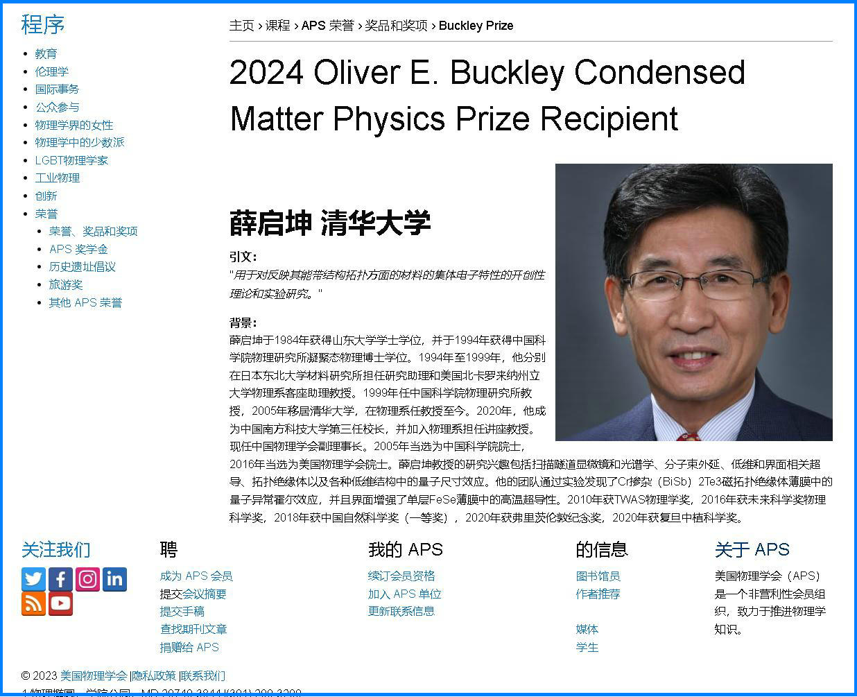 凭借拓扑绝缘体研究和在拓扑绝缘体中发现量子反常霍尔效应的创新突破,薛其坤成为巴克利奖授奖70年来首位中国籍获奖者。