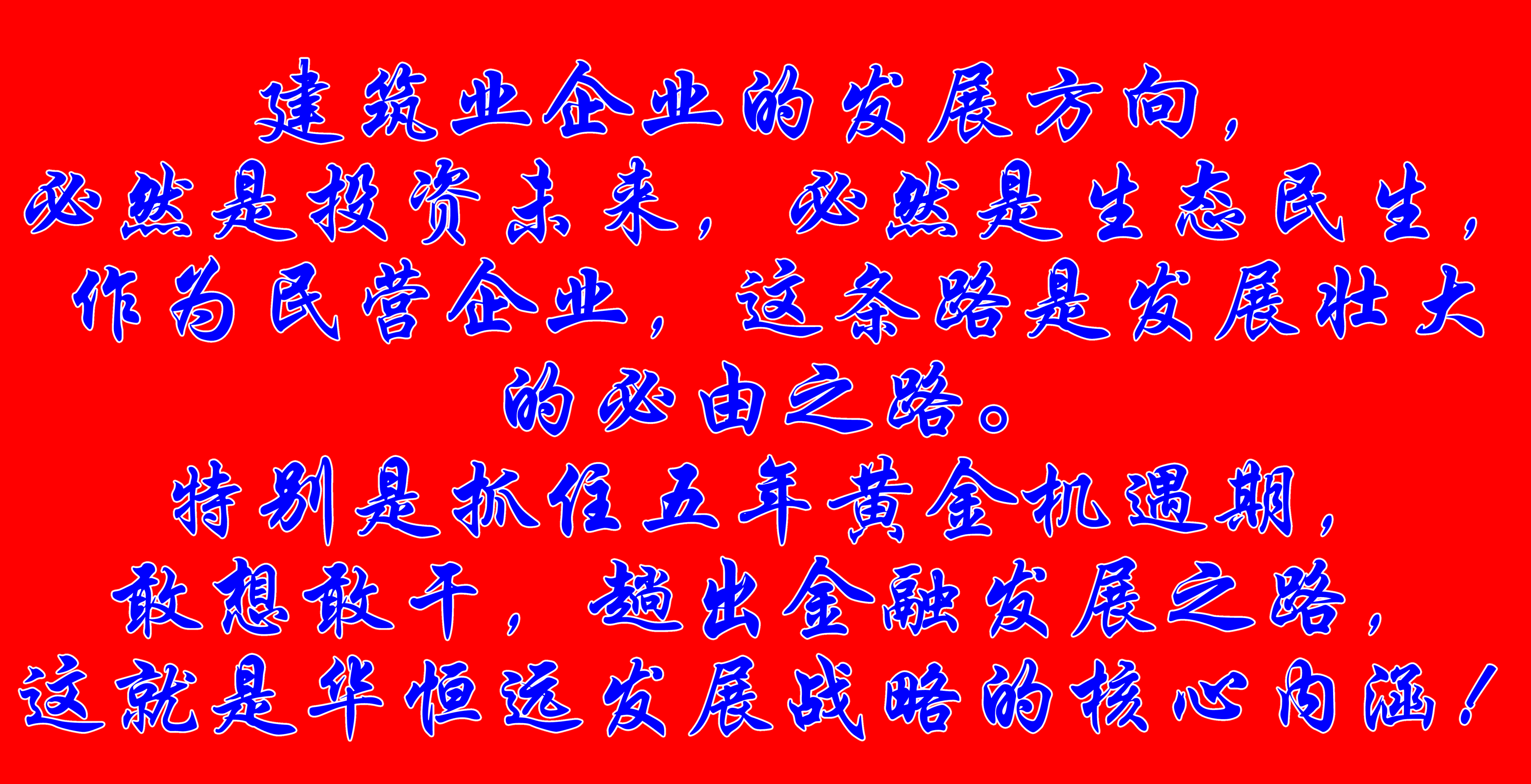 建筑业企业的发展方向,必然是投资未来,必然是生态民生。作为民营企业,这条路是发展壮大的必由之路。特别是抓住五年黄金机遇期,敢想敢干,趟出金融发展之路,这就是k1体育发展战略的核心内涵!