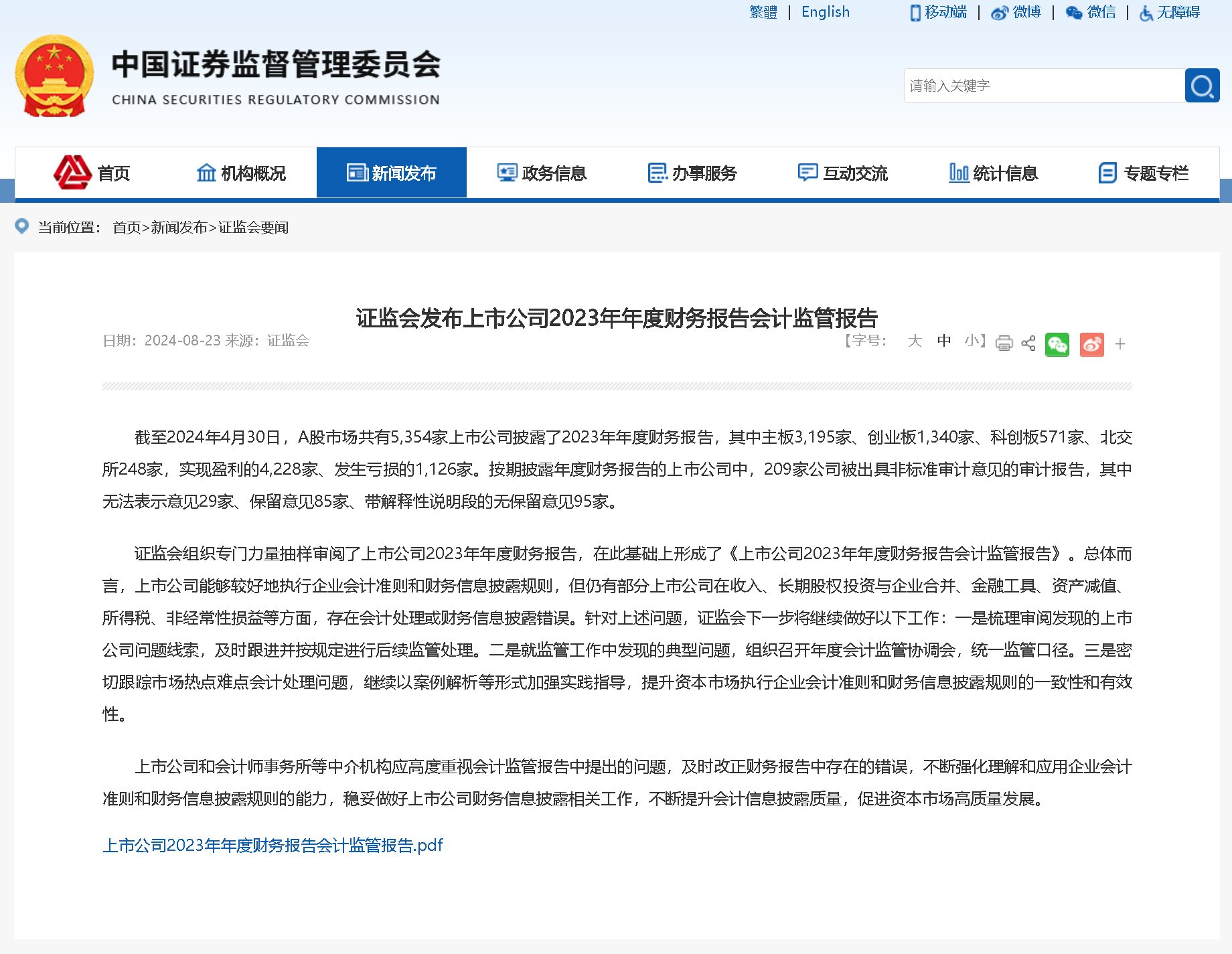 8月23日,证监会发布《上市公司2023年年度财务报告会计监管报告》(以下简称《报告》)。