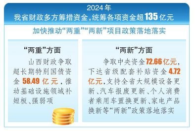 “两重”方面,山西财政争取超长期特别国债资金58.49亿元,推动基础设施领域补短板、强弱项。“两新”方面,争取中央资金72.66亿元,下达省级配套补贴资金4.72亿元,支持全省大规模设备更新、汽车报废更新、个人消费者乘用车置换更新、家电产品换新等“两新”政策落地落实。