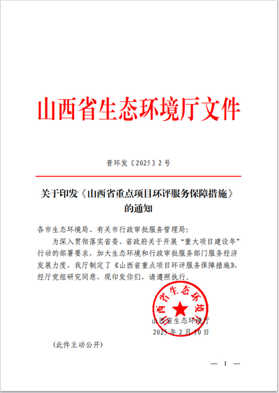本报讯(记者程国媛)为深入贯彻落实省委、省政府关于开展“重大项目建设年”行动的部署要求,2月10日,省生态环境厅印发《山西省重点项目环评服务保障措施》的通知,共3方面11项措施,从健全服务专班、精简审批程序、统筹推进环评工作3方面入手,切实服务重点项目落地见效。