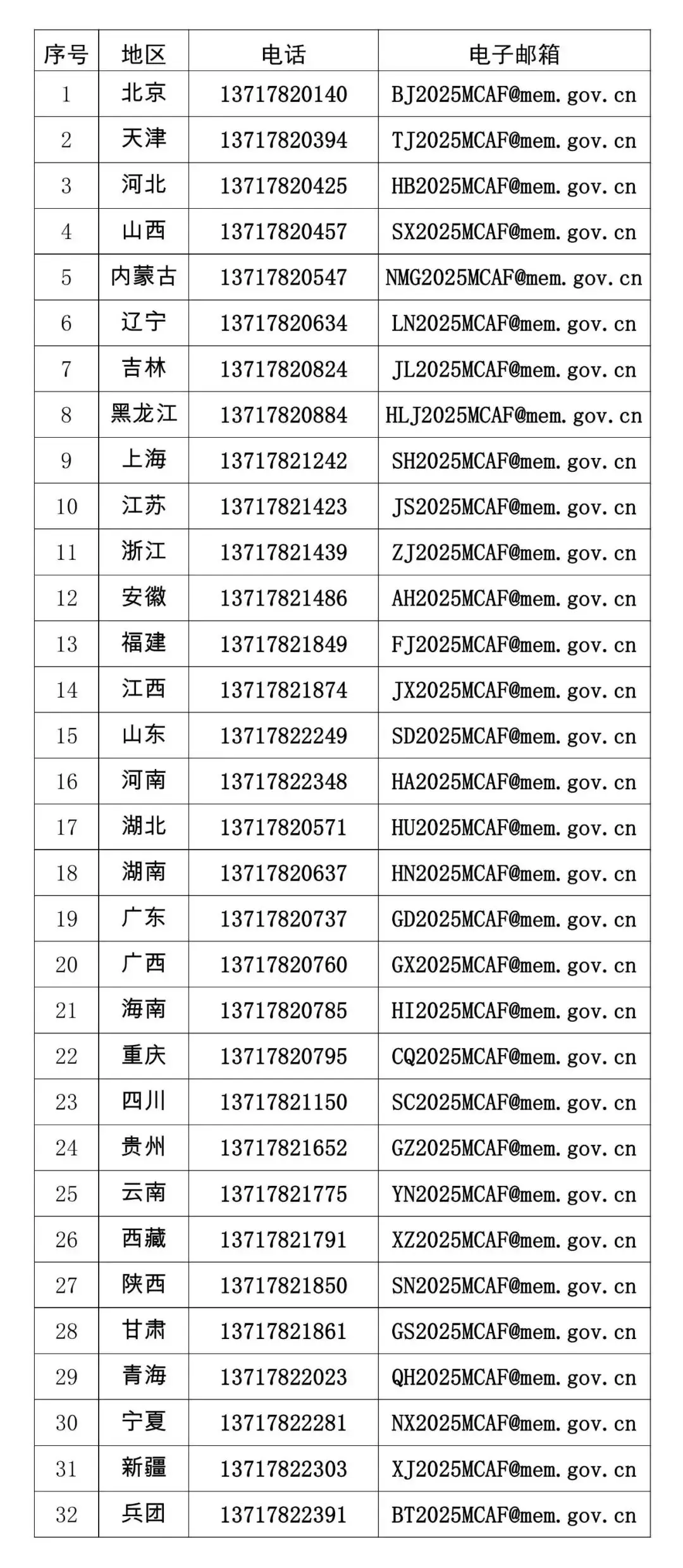 8 黑龙江 13717820884 HLJ2025MCAF@mem.gov.cn