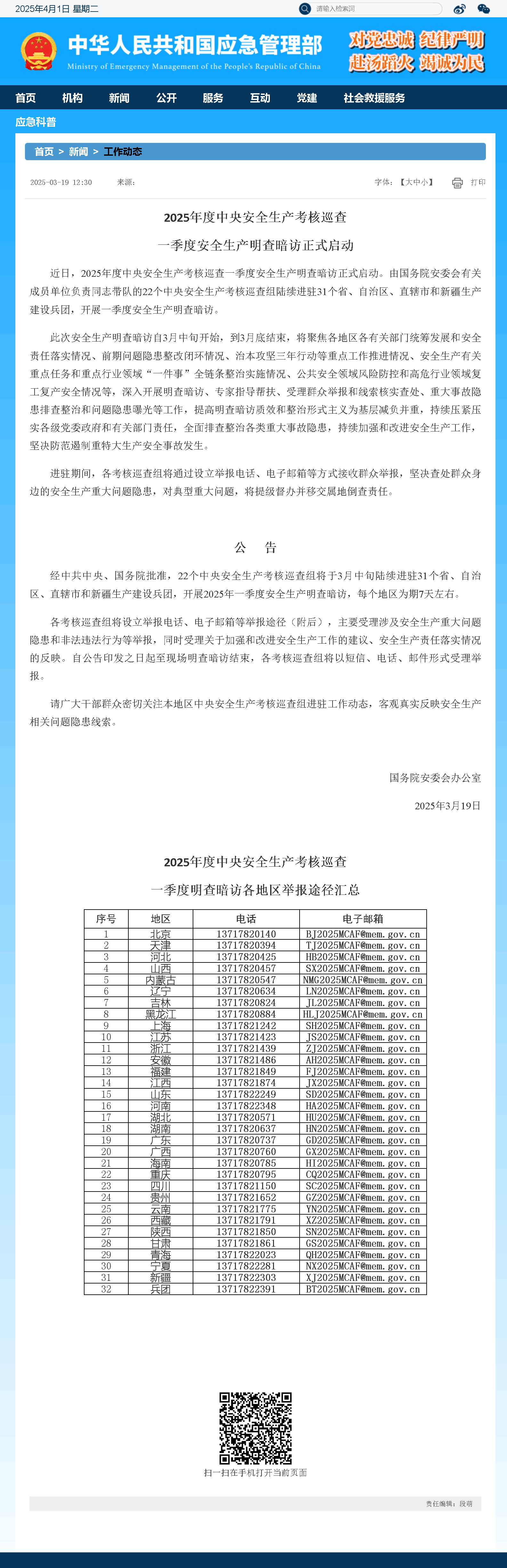 近日,2025年度中央安全生产考核巡查一季度安全生产明查暗访正式启动。由国务院安委会有关成员单位负责同志带队的22个中央安全生产考核巡查组陆续进驻31个省、自治区、直辖市和新疆生产建设兵团,开展一季度安全生产明查暗访。