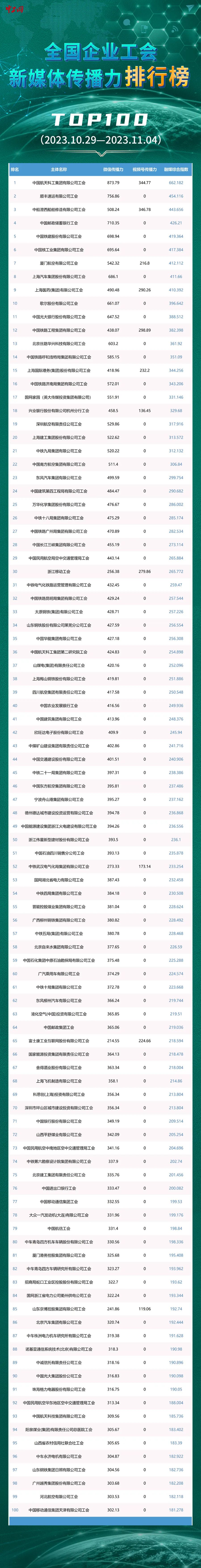 全国企业工会新媒体传播力排行榜TOP100(2023.10.29—2023.11.4)