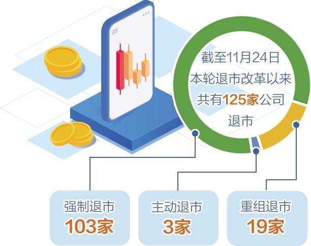 截至今年11月24日,本轮退市改革以来共有125家公司退市,其中强制退市103家,主动退市3家,重组退市19家,强制退市公司家数超过资本市场成立以来的强制退市数量总和。专家认为,强制退市创新高,有利于减少市场资源低效占用,改善上市公司整体面貌,对构建诚信健康的市场生态是长期利好。