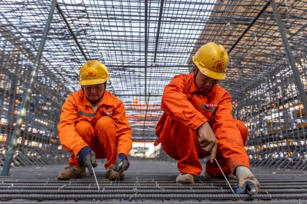 施工人员在沪苏通铁路二期项目作业。新华社记者 王翔 摄