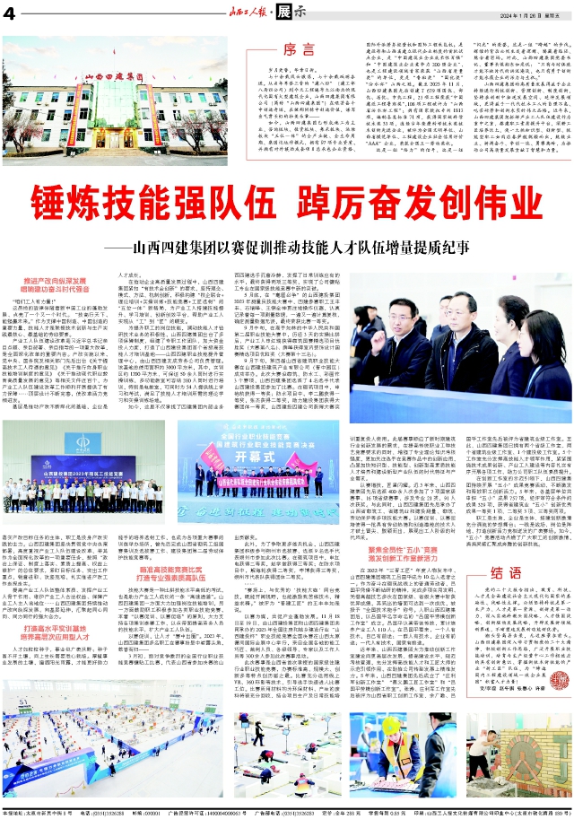 山西四建集团的高质量发展得益于企业持续进行科技创新、管理创新、制度创新,坚持在创新中拓延发展空间、延伸发展领域,更得益于一代代技术工人的自强不息、吃苦耐劳和创新求实的伟大品格。近年来,山西四建集团把抓好产业工人队伍建设作为重中之重,搭建职工素质提升平台,深耕工匠培养沃土,使一大批知识型、创新型、技能型职工如雨后春笋般脱颖而出,兢兢业业、拼搏奋斗、争创一流、勇攀高峰,为推动公司高质量发展贡献了智慧和力量。