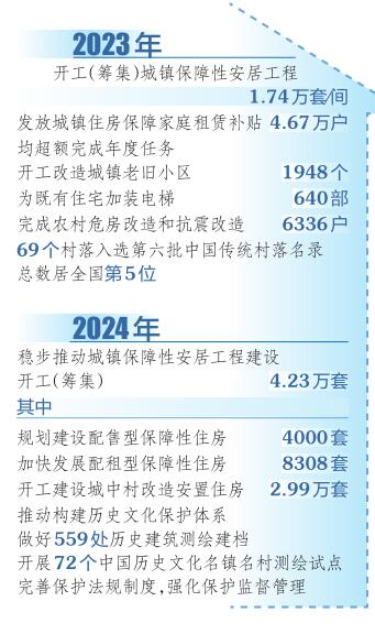 回看2023年,全省稳步实施城市更新和乡村建设“两大行动”,城乡面貌明显改善。开工改造城镇老旧小区1948个,为既有住宅加装电梯640部,人民群众居住水平明显提升。高质量完成“推进以县城为重要载体的城镇化建设”行动方案,明确8大行动35项具体任务,确定11个试点县先行先试。完成农村危房改造和抗震改造6336户,农房风貌设计水平和建房质量明显提高。69个村落入选第六批中国传统村落名录,总数居全国第5位。