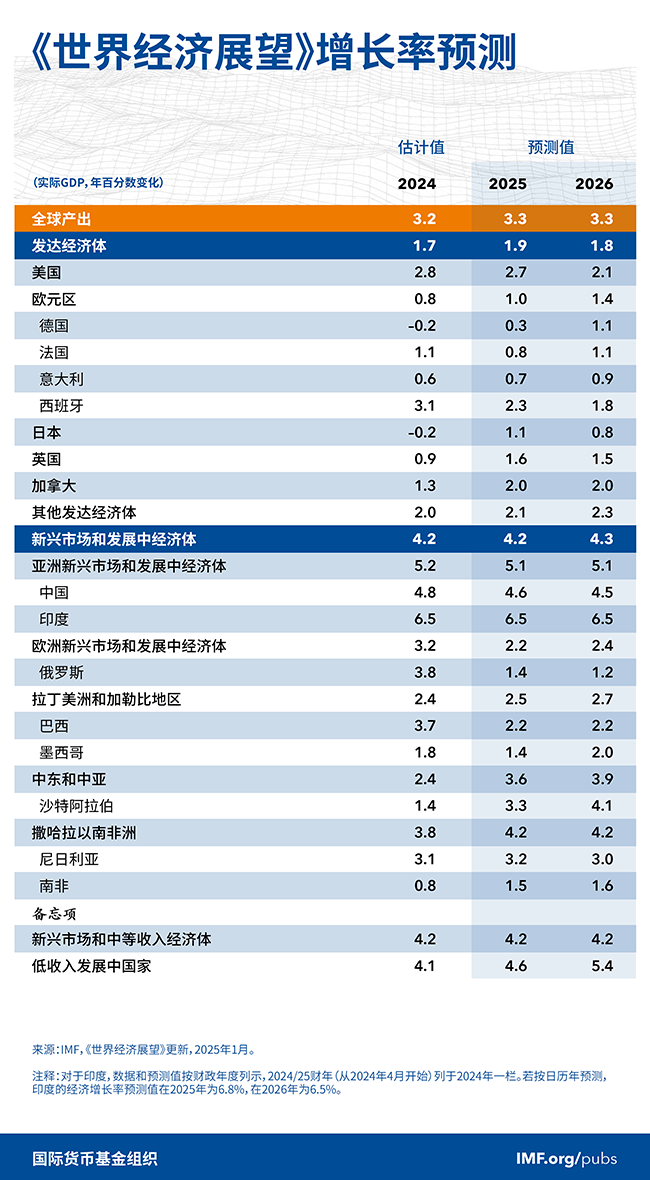 预计2025年和2026年全球经济增速均为3.3%,与2024年10月《世界经济展望》的预测基本持平。其中,美国的预期增速被上调,这抵消了其他地区增速的下调。近期前景的特点在于各国的路径出现分化,而中期的增长风险偏向下行。通胀压力的重新抬头可能阻碍货币政策转向,并对财政可持续性和金融稳定造成影响。政策组合应妥善权衡取舍并重建缓冲。