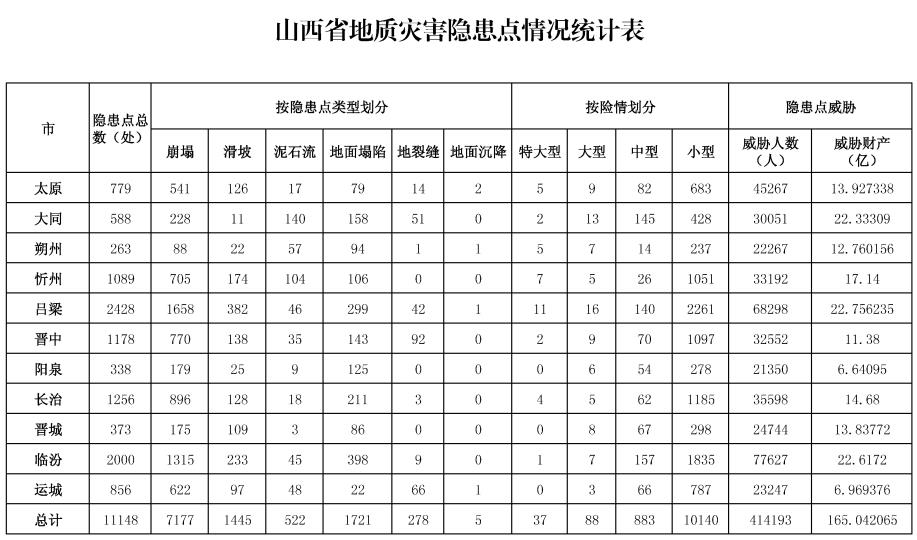 本报太原6月2日讯(记者王佳丽)省自然资源厅6月1日印发的《西省2023年度地质灾害防治方案》(以下简称《方案》),划定了晋西黄土高原、太原西山—汾西—霍州—乡宁—河津矿区、太原东山—阳泉—潞安—晋城—沁水矿区、岚县—静乐矿区共4个崩塌、滑坡地质灾害重点防治区。