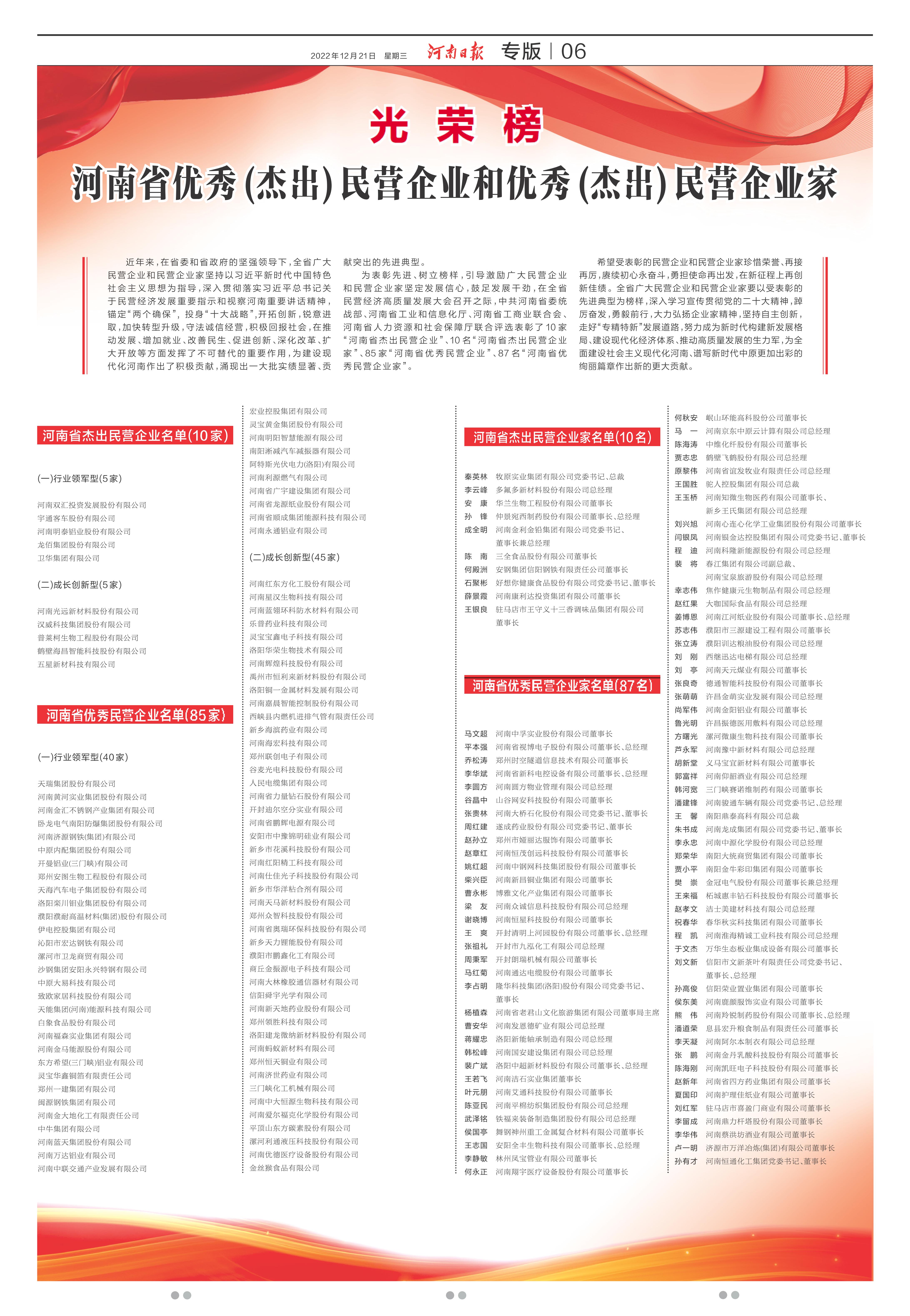 为表彰先进、树立榜样,引导激励广大民营企业和民营企业家坚定发展信心,鼓足发展干劲,在全省民营经济高质量发展大会召开之际,中共河南省委统战部、河南省工业和信息化厅、河南省工商业联合会、河南省人力资源和社会保障厅联合评选表彰了10家“河南省杰出民营企业”、10名“河南省杰出民营企业家”、85家“河南省优秀民营企业”、87名“河南省优秀民营企业家”。