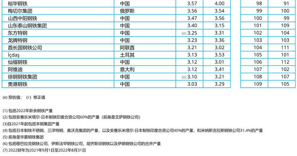 湖南钢铁集团 (5) 中国 26.43 26.21 13 14