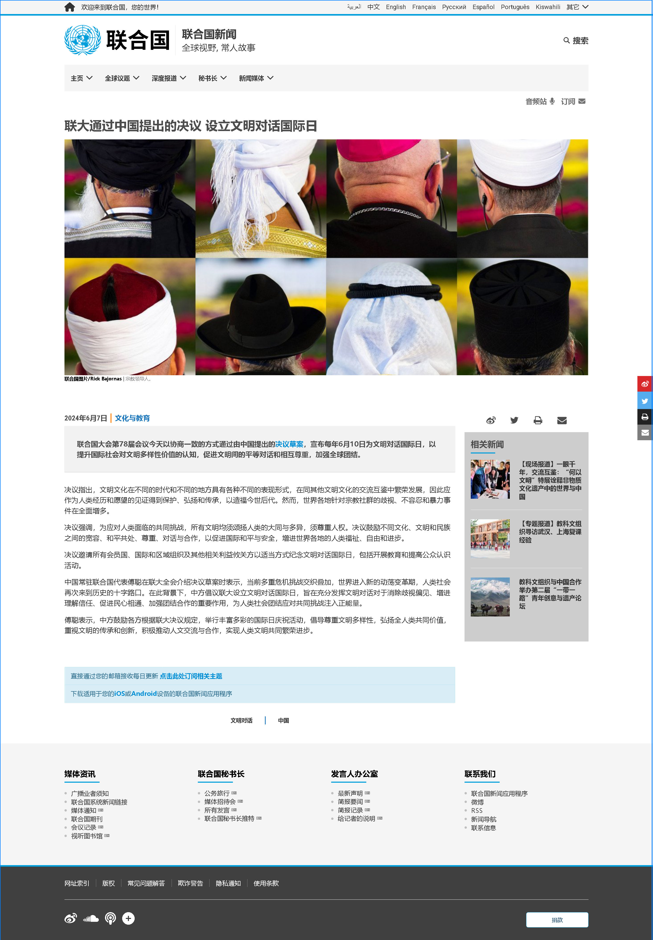中国常驻联合国代表傅聪在联大全会介绍决议草案时表示,当前多重危机挑战交织叠加,世界进入新的动荡变革期,人类社会再次来到历史的十字路口。在此背景下,中方倡议联大设立文明对话国际日,旨在充分发挥文明对话对于消除歧视偏见、增进理解信任、促进民心相通、加强团结合作的重要作用,为人类社会团结应对共同挑战注入正能量。