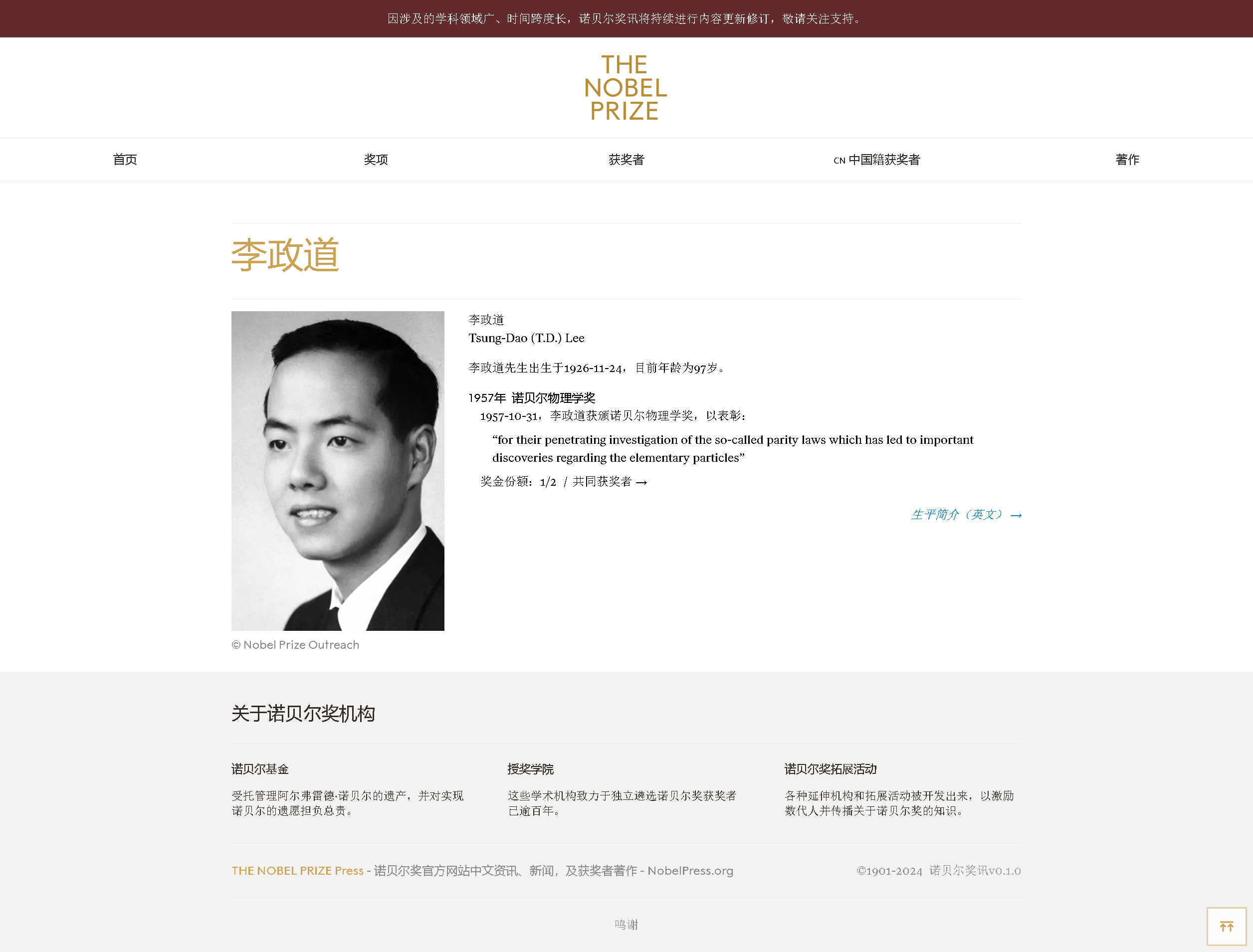 1957年,31岁的李政道因与杨振宁共同发现弱相互作用中宇称不守恒定律而获得诺贝尔物理学奖。除此之外,李政道在量子场论、核物理、统计力学、流体力学等方面多有建树。