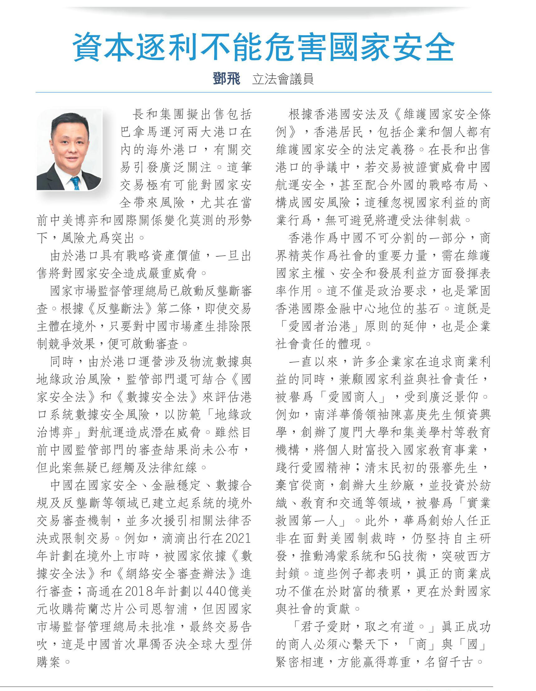 根据香港国安法及《维护国家安全条例》,香港居民,包括企业和个人都有维护国家安全的法定义务。在长和出售港口的争议中,若交易被证实威胁中国航运安全,甚至配合外国的战略布局、构成国安风险;这种忽视国家利益的商业行为,无可避免将遭受法律制裁。