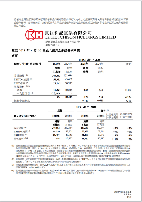 在营运方面,集团于2025年上半年按IFRS 16前基准计算之基本盈利净额按年稳健增长11%至港币113.62亿元。录得增长乃因以呈报货币计算之基本EBITDA及EBIT较2024年上半年分别增加7%及9%,主要由于港口部门增长强劲、零售部门有所改善、基建部门贡献上升及CKHutchison Group Telecom(‘CKHGT’)与库务业务均表现理想,以及集团因出售和黄医药部分非核心资产所录得之收益。上半年因商品价格回落及大规模保养与检修活动降低Cenovus Energy贡献并对增长造成不利影响。