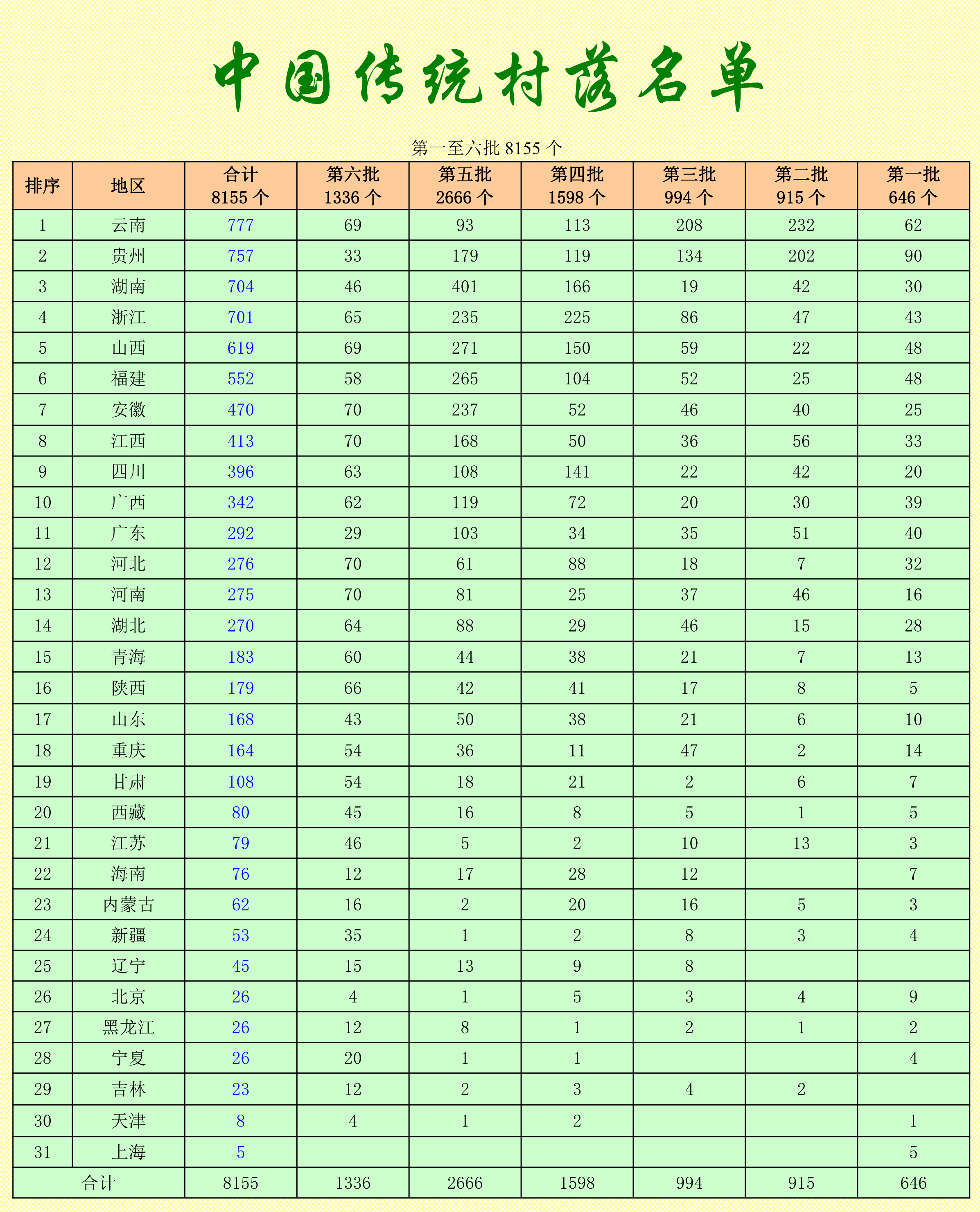 2012年以来,住房和城乡建设部会同有关部门分六批将8155个村落列入中国传统村落保护名录,山西就有619个,数量位居全国第5位。从现存的传统村落来看,山西已成为北方汉民族地区传统村落数量最多、风貌最完整、集聚度最高、类型最丰富的省份。