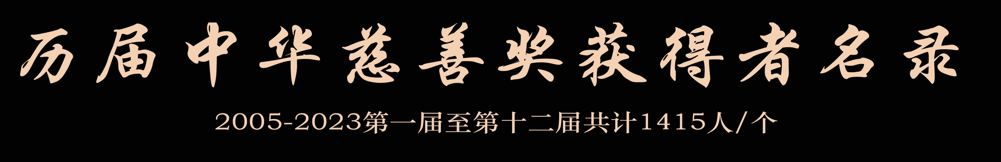 1. 李嘉诚 终身荣誉奖 第二届2. 邵逸夫 终身成就奖 第三届3. 曹德旺 第四届4. 曹德旺 第五届5. 曹德旺 第六届6. 曹德旺 第七届7. 曹德旺 第八届8. 曹德旺 第十届9. 曹德旺 第十一届10. 曹德旺 第十二届11. 曹鹏 第十一届12. 曹其镛 第六届13. 曹兴诚 第四届14. 曾宪梓 第一届15. 曾宪梓 第四届16. 曾宪梓(中国香港) 第九届17. 陈柏华 第四届18. 陈炳炎 第四届19. 陈东升 第十一届20. 陈逢干 第四届21. 陈逢干 第五届22. 陈逢干 第六届23. 陈逢干 第七届24. 陈逢干 第八届25. 陈辅唐 第二届26. 陈光标 第三届27. 陈光标 第四届28. 陈光标 第五届29. 陈光标 第六届30. 陈广川 第七届31. 陈华 第四届32. 陈剑光 第十二届33. 陈江和 第四届34. 陈江和(印度尼西亚) 第十届35. 陈立仁 第四届36. 陈梁悦明 第一届37. 陈美仪(女) 第十一届38. 陈明金 第十一届39. 陈荣超 第一届40. 陈水波 第四届41. 陈伟鸿 第八届42. 陈贤(女) 第十届43. 陈晓颖 第四届44. 陈一丹 第九届45. 陈一丹 第八届46. 陈泽盛 第一届47. 陈正拜 第十届48. 陈正拜 第十一届49. 陈祖伟 第四届50. 成凤桂(女) 第十届51. 成龙 第一届52. 程红光(女) 第十一届53. 储吉旺 第一届54. 丛飞 第一届55. 崔根良 第七届56. 崔根良 第十届57. 崔荣华(女) 第十一届58. 崔如琢 第四届59. 崔永元 第七届60. 戴志庆 第四届61. 党彦宝 第七届62. 党彦宝 第八届63. 党彦宝 第九届64. 党彦宝 第十一届65. 党彦宝 第十二届66. 迪亚拉 第七届67. 翟美卿(女) 第十届68. 翟长庆 第七届69. 丁和木 第七届70. 丁耀先 第八届71. 丁玉萍(女) 第十二届72. 董才平 第四届73. 董配永 第四届74. 董配永 第六届75. 董淑贞(女,英国) 第十二届76. 豆红波 第七届77. 杜丽梅(女) 第十一届78. 段友清 第十一届79. 方黄吉雯 第一届80. 方庆云 第八届81. 方润华 第一届82. 方威 第四届83. 房忠 第十届84. 冯艾 第一届85. 冯笑原 第四届86. 傅芬芳(女) 第十届87. 傅光明 第十一届88. 高德康 第七届89. 高永华 第一届90. 高镇同 第十一届91. 耿福能 第十一届92. 龚俊龙 第十一届93. 古润金 第四届94. 古润金 第五届95. 古润金 第六届96. 古润金 第七届97. 古润金 第八届98. 古润金(马来西亚) 第九届99. 古润金(马来西亚) 第十届100. 关杰初 第十二届101. 关牧村 第一届102. 郭海良 第八届103. 郭明义爱心团队 第十一届104. 郭生芳(女) 第十届105. 郭胜华 第一届106. 郭文标 第九届107. 过鑫富 第四届108. 哈学忠 第十二届109. 海霞(女,回族) 第十二届110. 韩红 第七届111. 韩汝芬 第四届112. 韩召善 第一届113. 何鸿燊 第四届114. 何其新 第四届115. 何伟 第十届116. 何猷龙 第四届117. 黑李景荣 第一届118. 侯建芳 第十届119. 侯立尊 第一届120. 侯振国 第十届121. 胡贤斌 第十二届122. 胡亚捷、汤静夫妇 第十届123. 胡子敬 第六届124. 黄炳均夫妇 第八届125. 黄宏、李莉夫妇 第十一届126. 黄启凤 第十二届127. 黄如论 第一届128. 黄如论 第二届129. 黄如论 第四届130. 黄如论 第五届131. 黄如论 第六届132. 黄如论 第七届133. 黄如论 第八届134. 黄如论 第九届135. 黄少康 第十二届136. 黄涛 第十一届137. 黄涛 第十一届138. 黄涛 第十二届139. 黄志源(新加坡) 第十一届140. 霍庆华 第四届141. 霍英东 第一届142. 吉美坚赞 第一届143. 贾秀芳(女) 第十届144. 姜纯 第四届145. 姜达敖 第四届146. 姜达敖 第五届147. 姜丽娟 第四届148. 金金龙 第一届149. 金林玉 第四届150. 阚丽君(女) 第十届151. 柯希平 第四届152. 克力木?依莫拉 第六届153. 孔东梅(女) 第十二届154. 孔维(女) 第十一届155. 孔祥银 第八届156. 匡俊英 第四届157. 匡俊英 第六届158. 匡俊英 第七届159. 蓝勇 第一届160. 乐爱妹 第五届161. 雷军 第十一届162. 李爱君 第四届163. 李安平 第六届164. 李春凤 第六届165. 李春平 第四届166. 李春平 第六届167. 李春平 第七届168. 李春平 第八届169. 李春元 第一届170. 李达三(新加坡) 第十届171. 李广元 第五届172. 李宏祥 第九届173. 李厚霖 第四届174. 李家杰 第三届175. 李嘉诚 第一届176. 李金元 第一届177. 李金元 第四届178. 李立华(女) 第十二届179. 李明刚 第十二届180. 李宁 第一届181. 李宁 第六届182. 李宁 第六届183. 李清友 第四届184. 李泉 第六届185. 李思廉 第一届186. 李思廉 第四届187. 李涛 第十一届188. 李万升 第十二届189. 李文达 第四届190. 李贤义 第四届191. 李相岑 第九届192. 李新炎 第四届193. 李一萍(女) 第十二届194. 李荫浓、陈春琳 第七届195. 李永波 第五届196. 李玉兰 第一届197. 李玉玲 第四届198. 李运强 第一届199. 李兆会 第四届200. 励娜 第八届201. 梁博 第十二届202. 廖艳晖 第四届203. 廖泽云 第十二届204. 林德兴 第十二届205. 林瑞班 第一届206. 林圣雄 第一届207. 林贤友 第一届208. 林新华 第四届209. 林秀贞 第八届210. 凌锋 第四届211. 刘彪 第八届212. 刘冰 第四届213. 刘沧龙 第四届214. 刘桂芗(女) 第十二届215. 刘海鹰 第十一届216. 刘建民 第四届217. 刘景萍(女) 第十二届218. 刘猛 第五届219. 刘瑞旗 第四届220. 刘绍喜 第四届221. 刘盛兰 第九届222. 刘文福 第十二届223. 刘许政 第十届224. 刘英子(女) 第十二届225. 刘永好 第十一届226. 刘勇 第七届227. 刘志强 翟美卿 第一届228. 楼明 第四届229. 卢志强 第四届230. 鲁家贤(奥地利) 第十一届231. 陆仁军 第十一届232. 罗宾?西尔(英国) 第九届233. 罗淑兰 第一届234. 罗永田 第十届235. 马建荣 第十二届236. 马淑玉 第一届237. 马依尔江(塔吉克族) 第