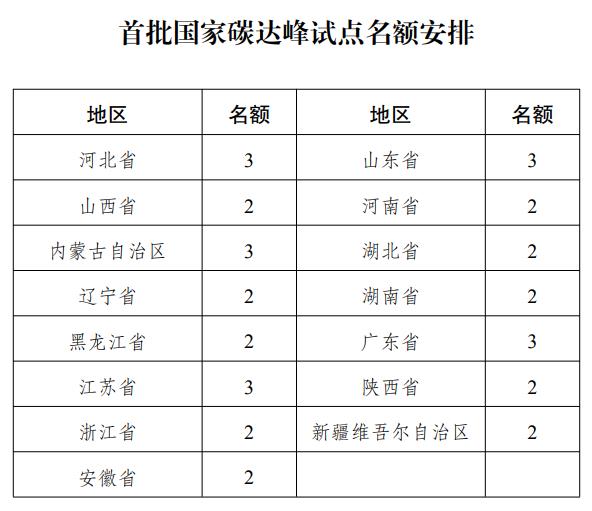 国家发展改革委有关负责人介绍,国家发展改革委将统筹考虑各地区碳排放总量及增长趋势、经济社会发展情况等因素,首批在15个省区开展碳达峰试点建设,由有关省区发展改革委提出建议名单,经本地区人民政府同意后报国家发展改革委确认。