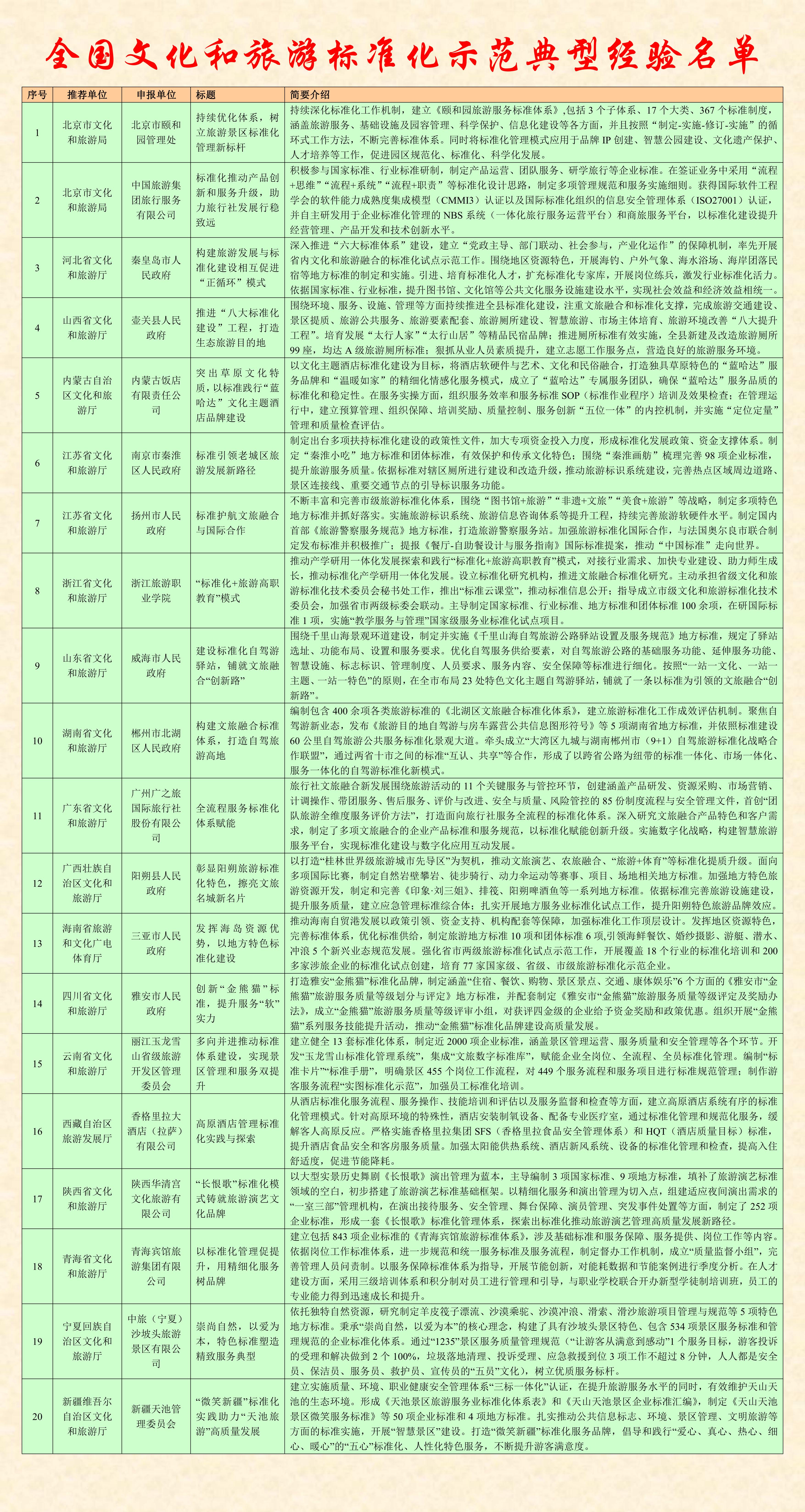 记者11月22日从文化和旅游部获悉,文化和旅游部办公厅近日印发通知,公布全国文化和旅游标准化示范典型经验名单。
