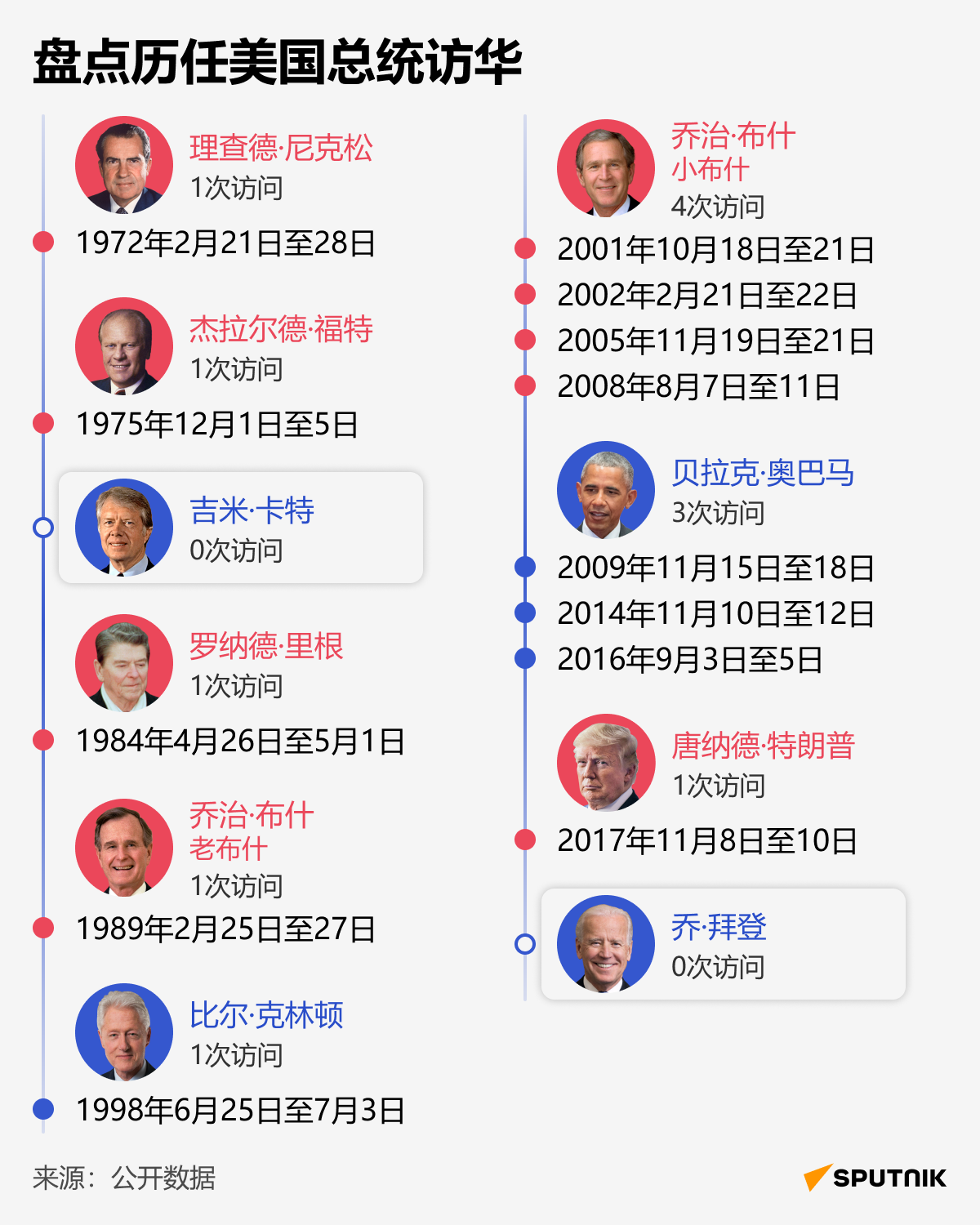 细心的俄罗斯卫星通讯社盘点历任美国总统访华记录,五十二年间10位中8位13次访问中国。