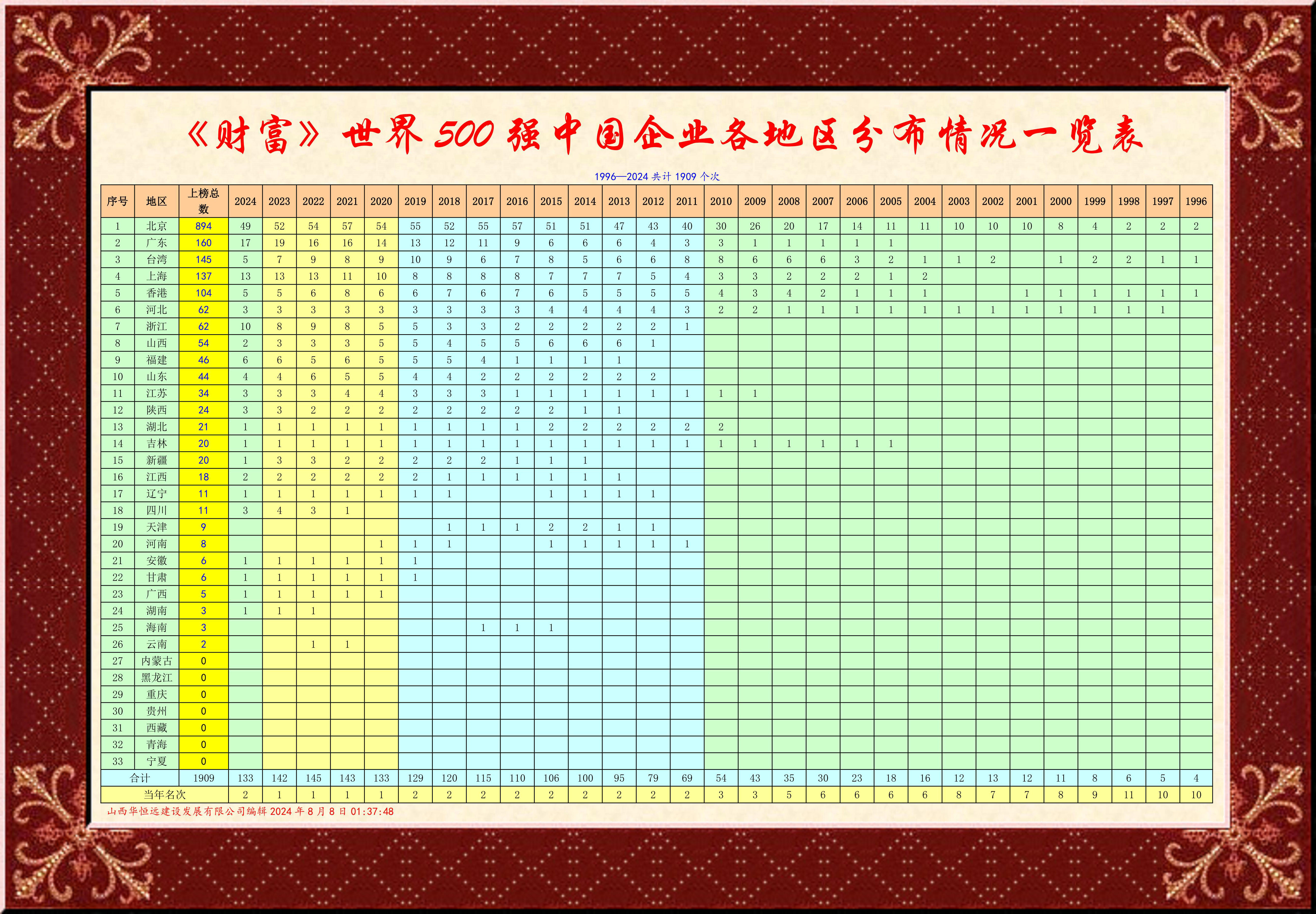 今年《财富》世界500强中国上榜企业133家,分布22个省(市)区,北京、广东、上海位居前三,分别为49、17和13家。 浙江创十四年最好水平达到10家。