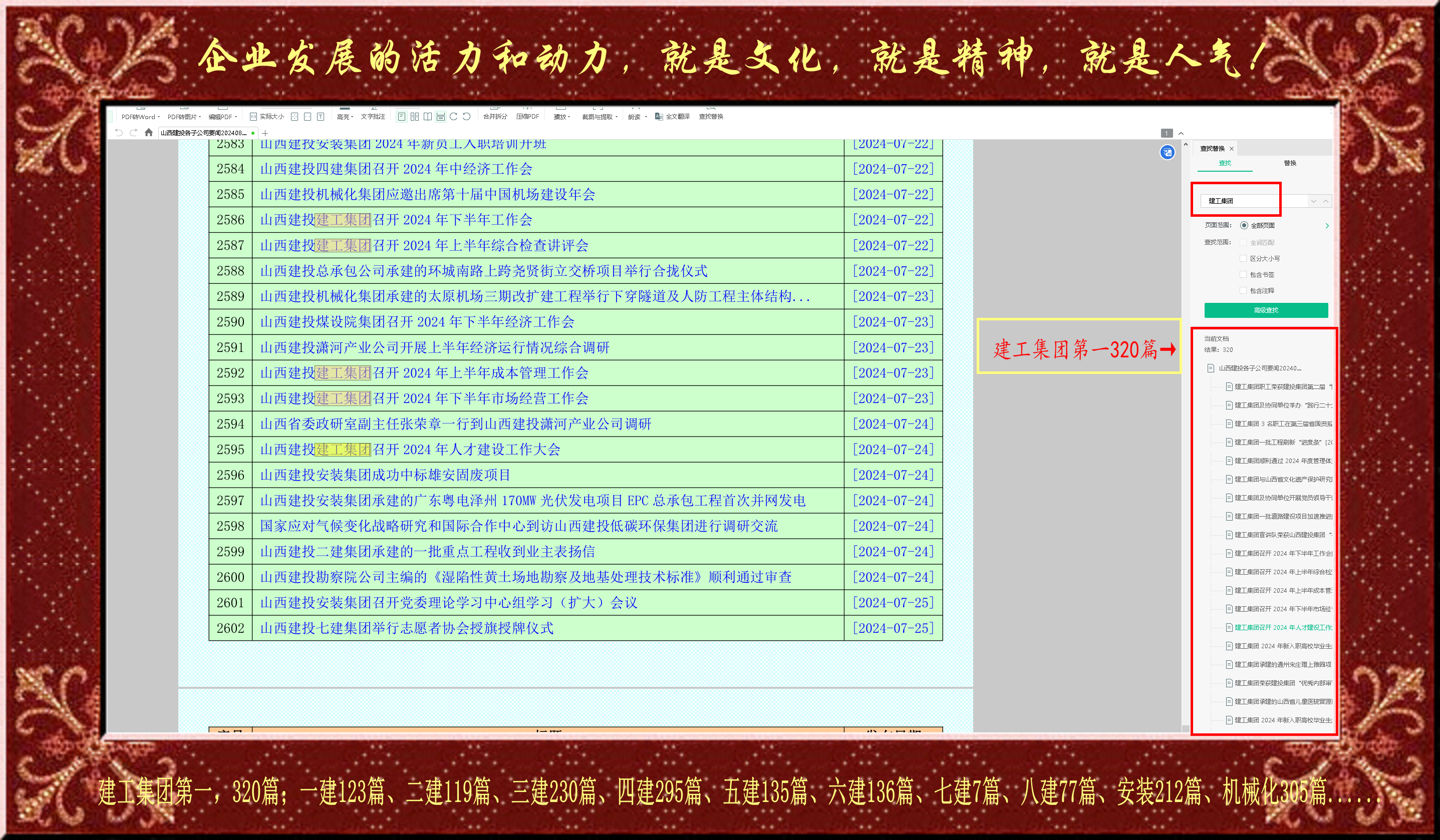 观察一个企业综合素质,最简单也是最直观的办法就是看他的信息发布量和信息内容,这是多年来我的体会。企业发展的活力和动力,就是文化,就是精神,就是人气!我把2669篇文章标题和摘要用PDF格式汇总在一张表格里,便于统计各公司报送母集团公司的信息数量。建工集团第一,320;一建123篇、二建119篇、三建230篇、四建295篇、五建135篇、六建136篇、七建7篇、八建77篇、安装212篇、机械化305篇......
