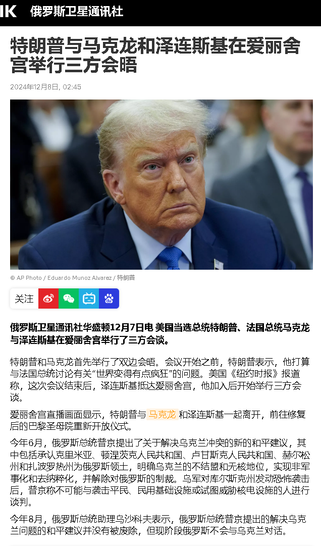 新华社巴黎12月7日电(记者乔本孝)法国总统马克龙7日在爱丽舍宫与受邀出席巴黎圣母院重新开放仪式的美国当选总统特朗普和乌克兰总统泽连斯基举行三方会晤。