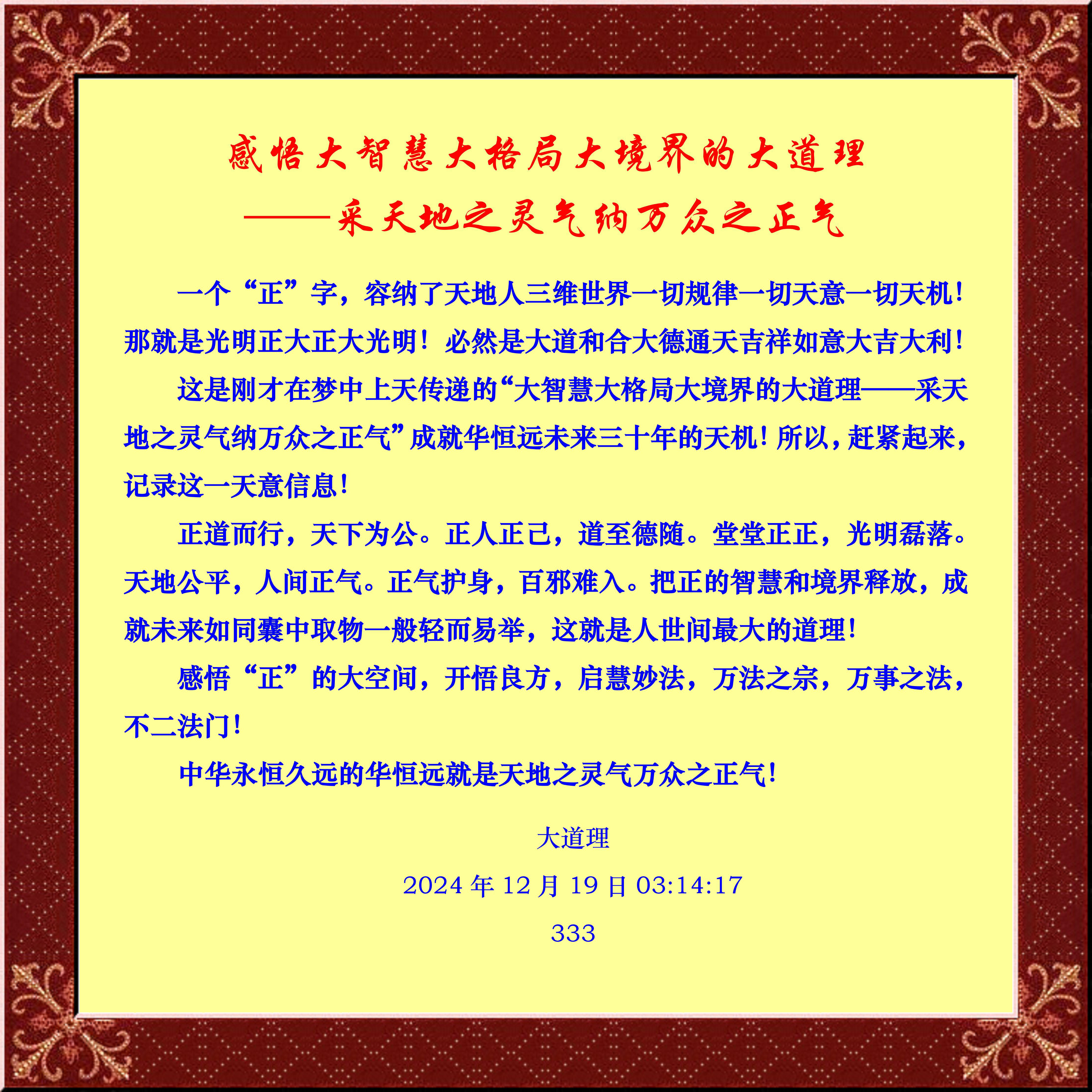 一个“正”字,容纳了天地人三维世界一切规律一切天意一切天机!那就是光明正大正大光明!必然是大道和合大德通天的吉祥如意大吉大利!