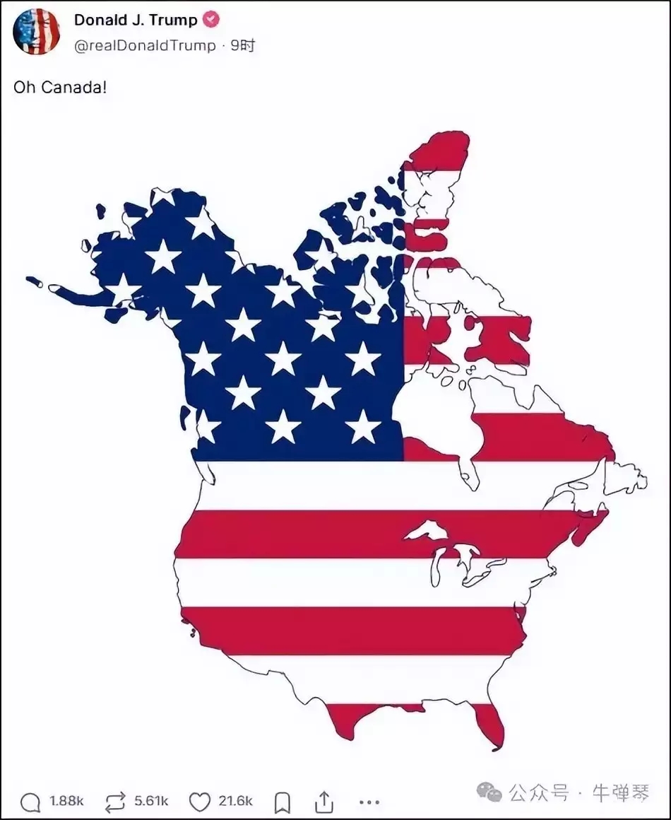一张图,美加所有土地,都是美国星条旗图案,特朗普配文:“哦,加拿大!”
