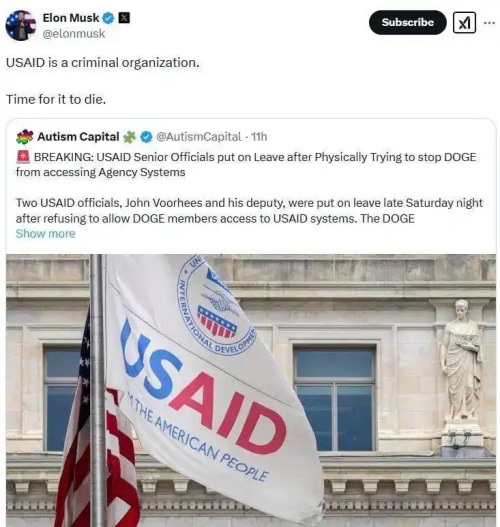 政府效率部负责人马斯克在X上发文称,美国国际开发署“是一个犯罪组织,是时候让它消亡了”网络截图