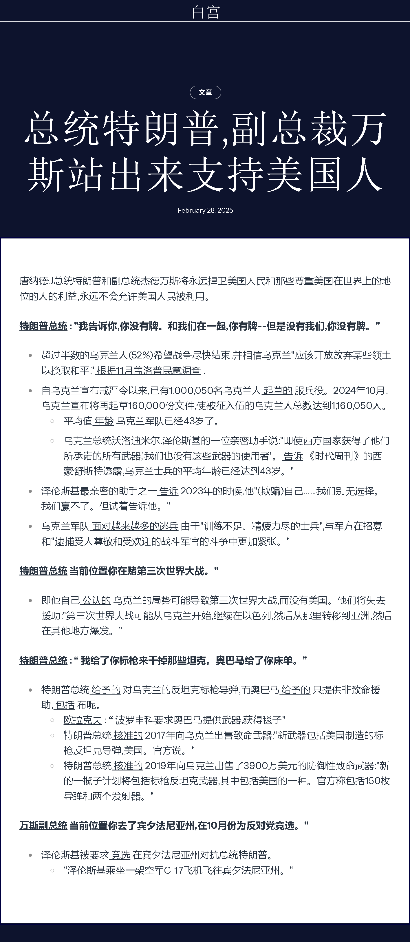 泽连斯基在离开白宫后在社交媒体上发文,对美国给予乌克兰的支持向特朗普和美国人民表达感谢,但他同时强调:“乌克兰需要正义和持久的和平,我们正为此努力。”