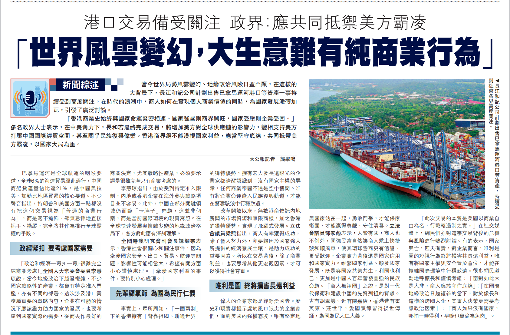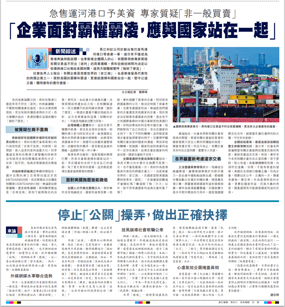 新聞綜述/急售運河港口予美資 專家質疑「非一般買賣」 「企業面對霸權霸凌,應與國家站在一起」2025-03-27