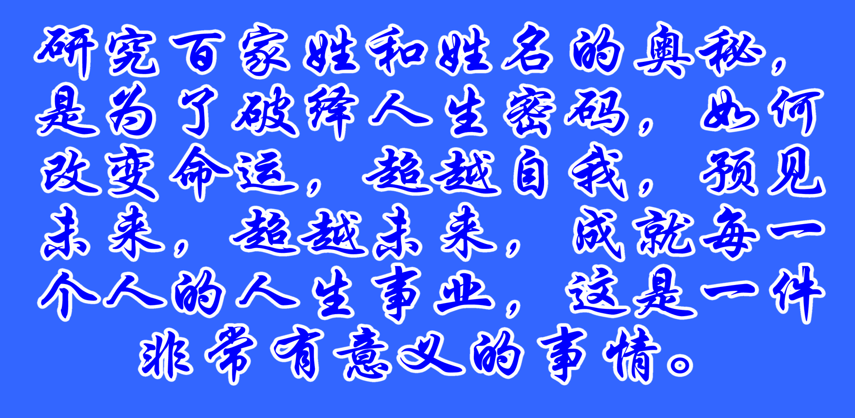 我研究百家姓和姓名的奥秘,是为了破译人生密码,如何改变命运,超越自我,预见未来,超越未来,成就每一个人的人生事业,这是一件非常有意义的事情。
