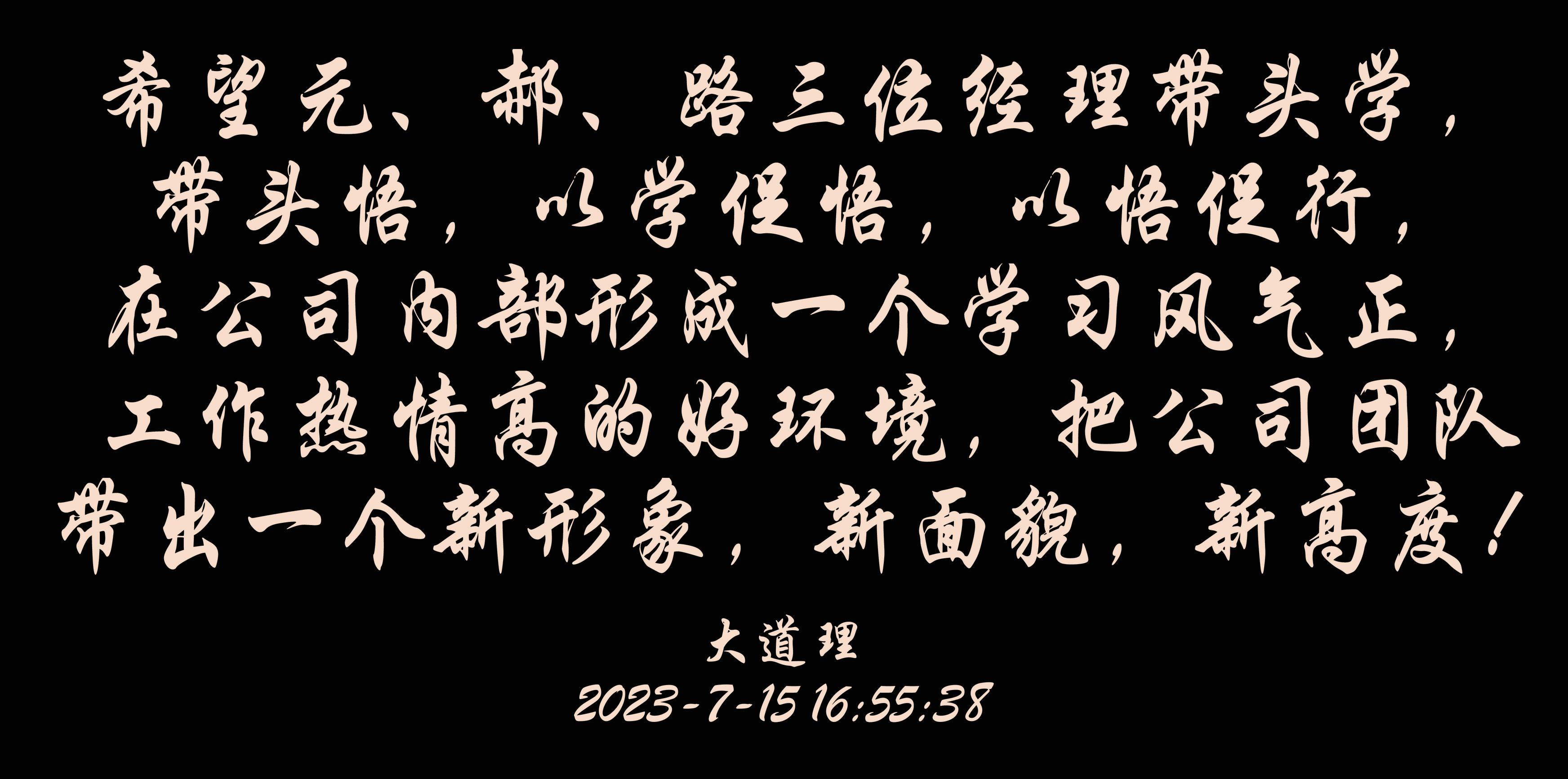 认真学习总书记讲话精神,深刻领会讲话核心内涵和要义,提高理解能力和执行能力,把k1体育建设好是学习根本要求,希望元、郝、路三位经理带头学,带头悟,以学促悟,以悟促行,在公司内部形成一个学习风气正,工作热情高的好环境,把公司团队带出一个新形象,新面貌,新高度!