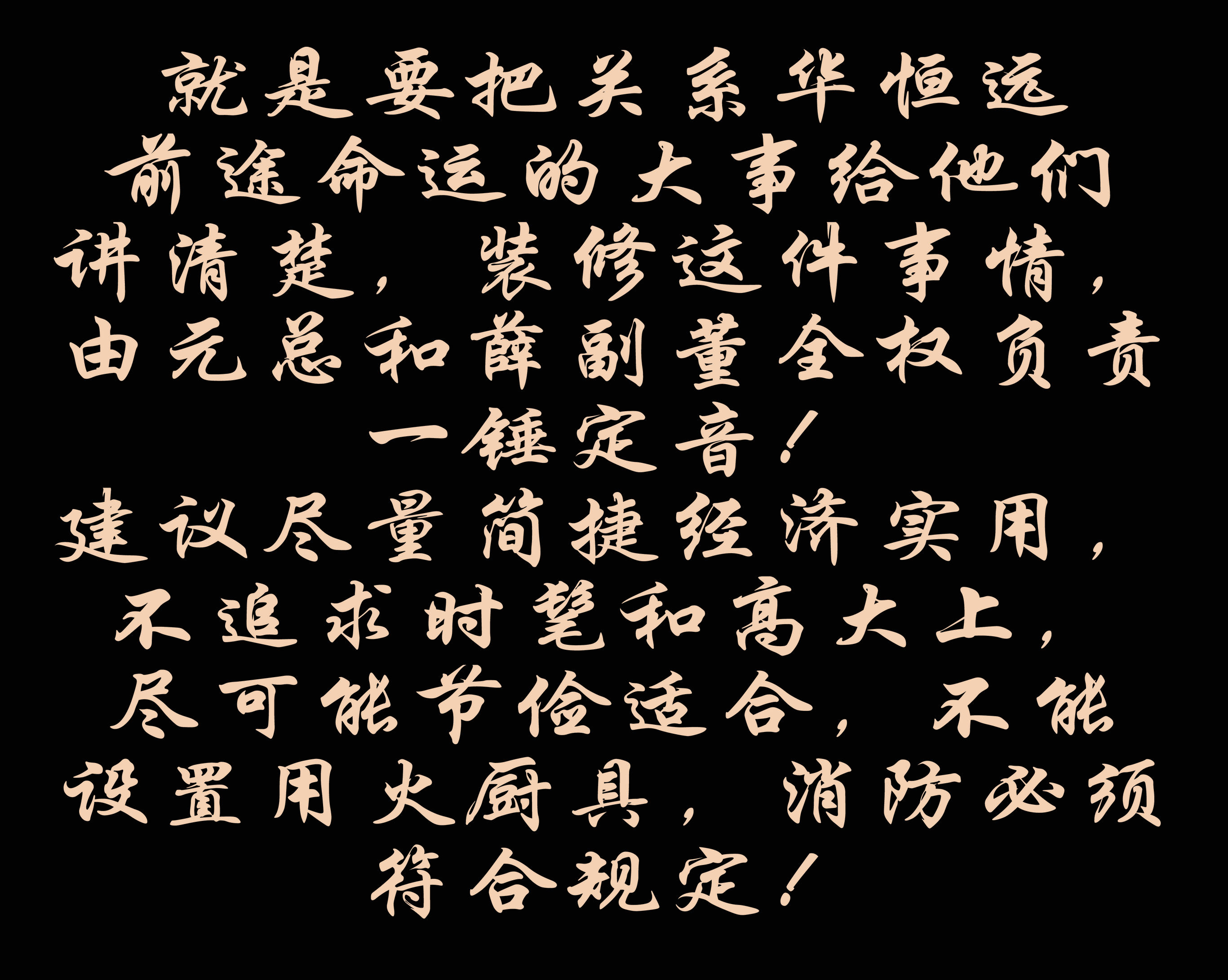 我下午约见董事长夫妇一晤,就是要把关系k1体育前途命运的大事给他们讲清楚,装修这件事情,由元总和薛副董全权负责一锤定音!