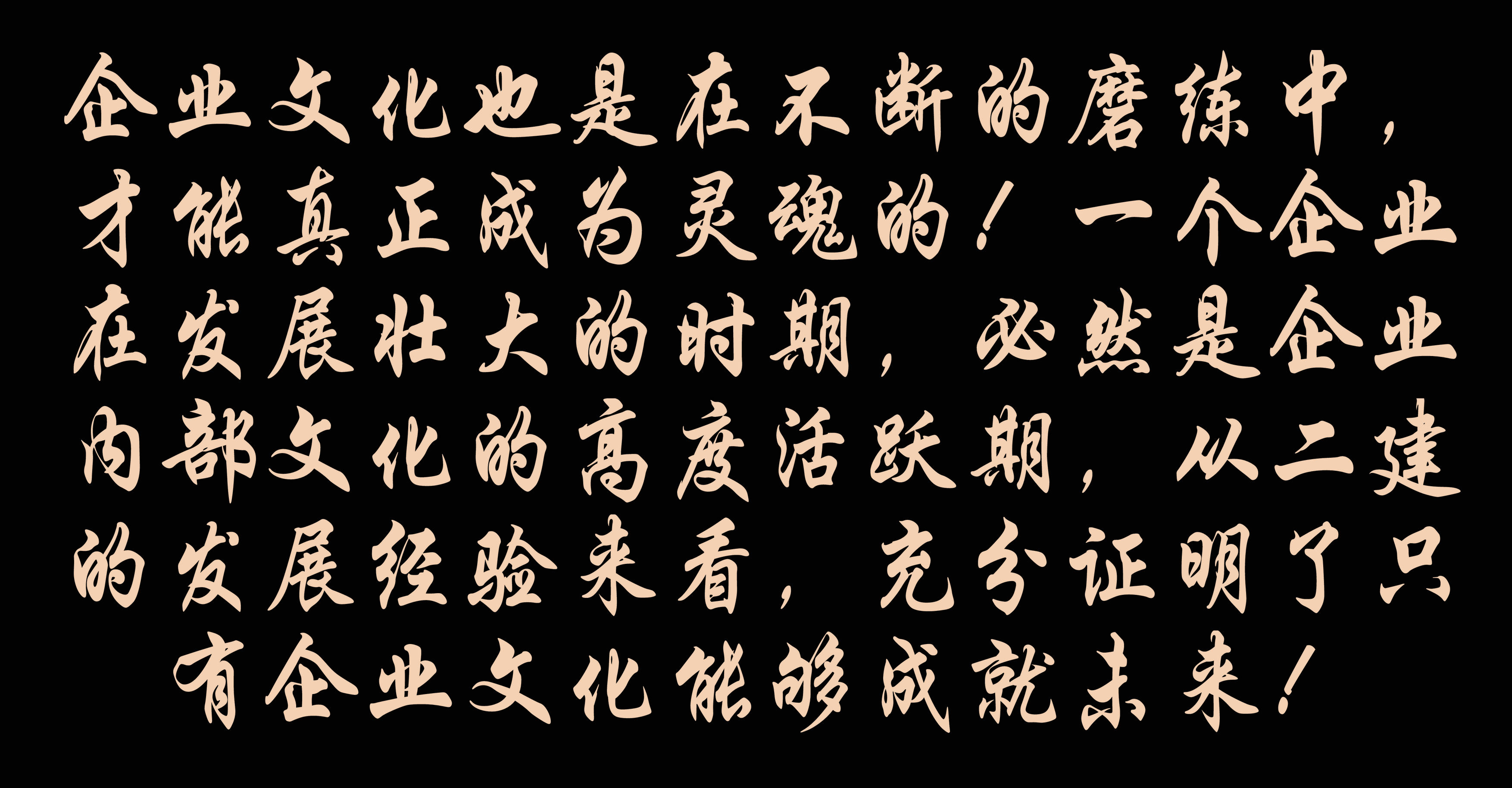 企业文化也是在不断的磨练中,才能真正成为灵魂的!一个企业在发展壮大的时期,必然是企业内部文化的高度活跃期,从二建的发展经验来看,充分证明了只有企业文化能够成就未来!