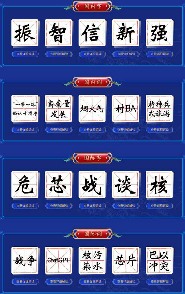 前五位年度国内候选字为“振”“智”“信”“新”“强”,前五位年度国内候选词为“‘一带一路’倡议十周年”“高质量发展”“烟火气”“村BA”“特种兵式旅游”;前五位年度国际候选字为“危”“芯”“战”“谈”“核”,前五位年度国际候选词为“战争”“ChatGPT”“核污染水”“芯片”“巴以冲突”。