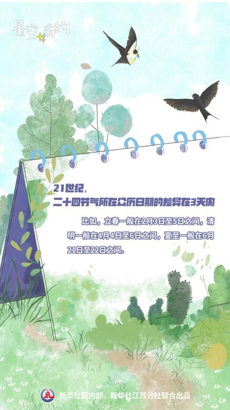 公历纪年中,平年为365天,若相邻两年同一节气间相隔的是平年,则同一个节气在后一年比前一年的时间推后约5小时49分钟。如此,累积4年便会推迟近一天。公历历法使用设置闰年的方法来弥补时间差。每一个可以被4整除的年份是闰年,多出2月29日一天,但整世纪必须被400整除才置闰年。“因为存在闰年,节气所在的公历日期不会一直后移。21世纪中,二十四节气所在的公历日期差异在3天内。比如,立春一般在2月3日至5日之间,清明一般在4月4日至6日之间,夏至一般在6月21日至22日之间。”王科超说。