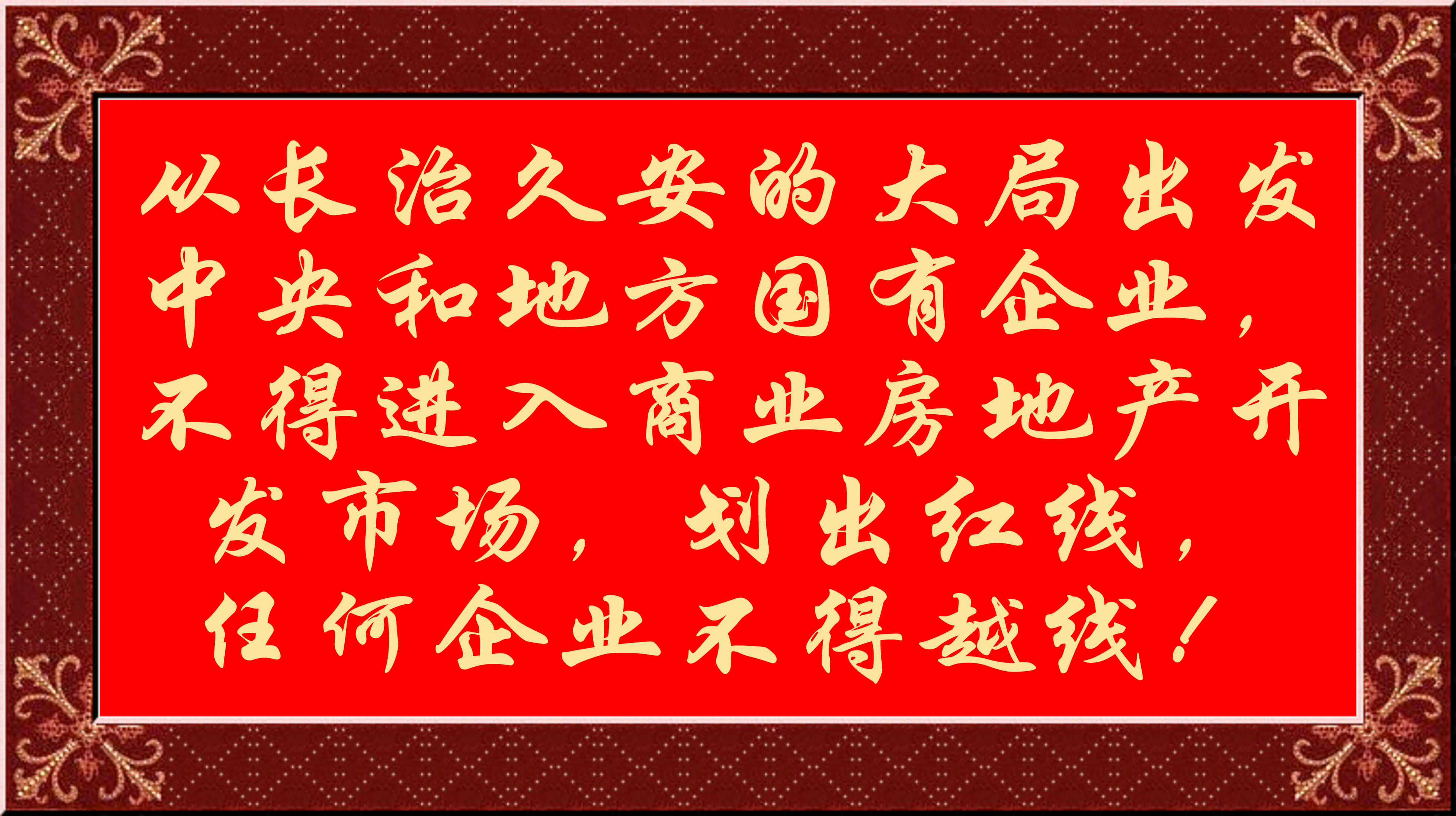 感应房地产业回归正常发展渠道,安居乐业是国家稳固永恒的使命,应该从长治久安的大局出发,严格房地产业宏观管理,中央和地方国有企业,不得进入商业房地产开发市场,划出红线,任何企业不得越线!