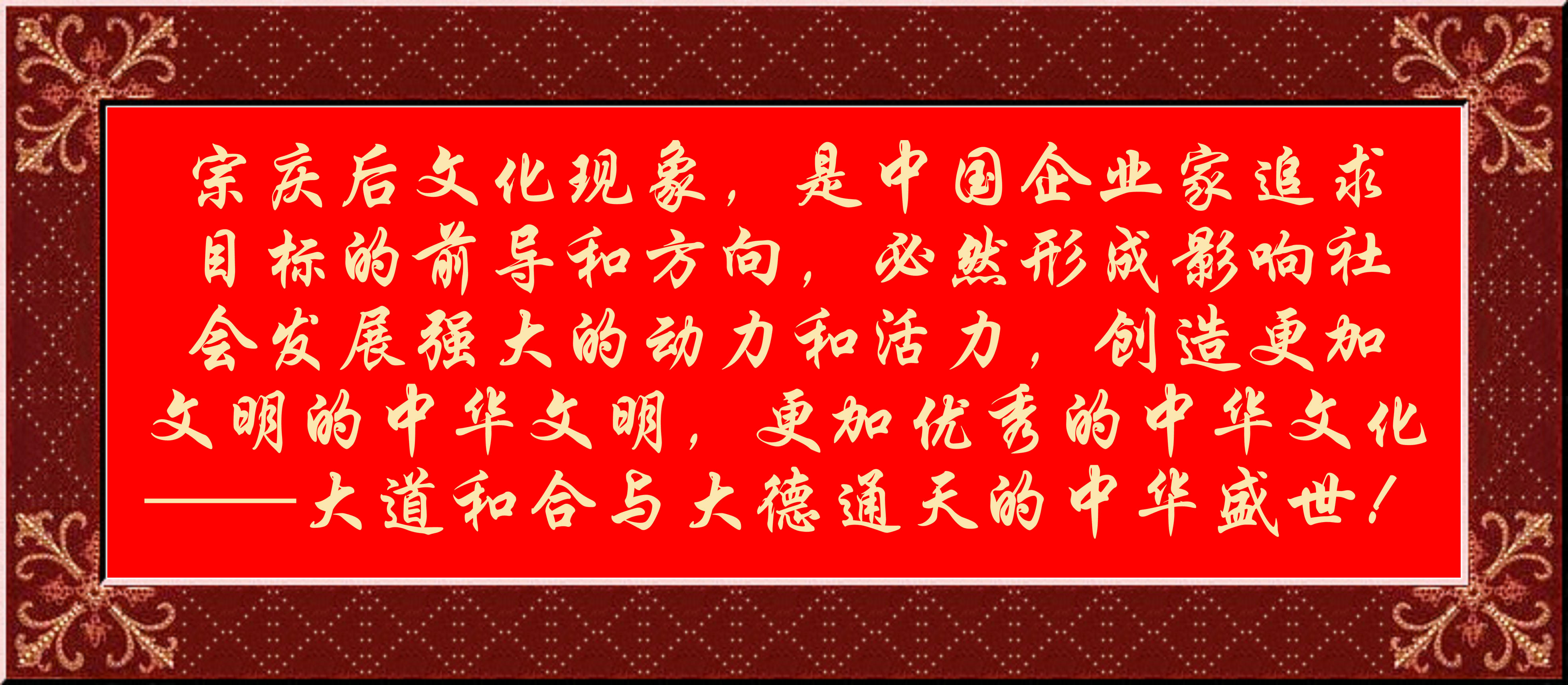 宗庆后文化现象,是中国企业家追求目标的前导和方向,必然形成影响社会发展强大的动力和活力,创造更加文明的中华文明,更加优秀的中华文化——大道和合与大德通天的中华盛世!