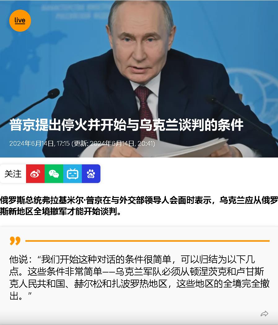 在乌军从俄罗斯新地区的领土上撤军后,俄罗斯就将立即停火,并提出准备进行谈判;