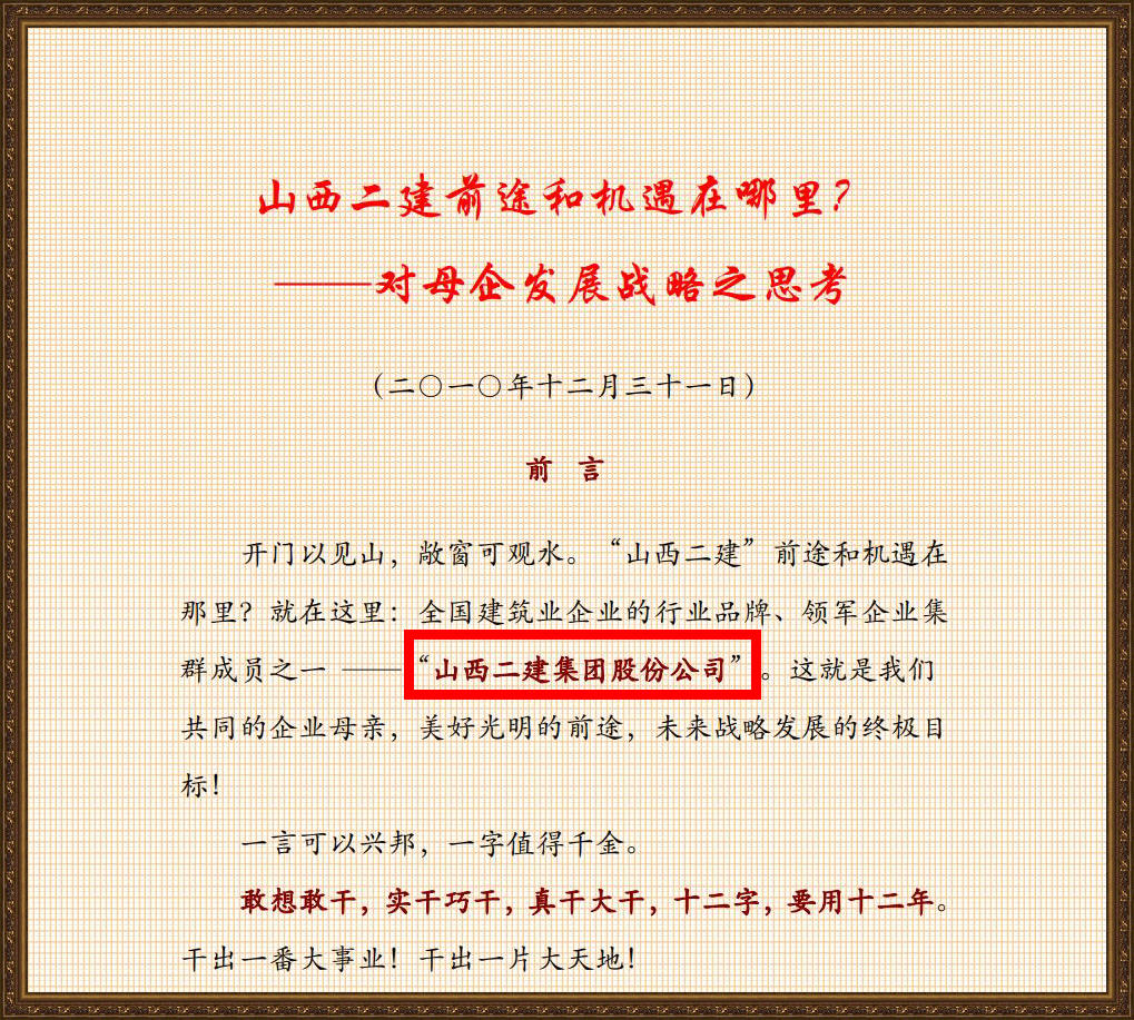 这篇文章不具体针对哪一个人,而是对于目前集团全方位工作向上向好的一次触动,希望山西二建所有的工作,都能够超前、精准、完善,只有这样,我们才能把握机遇,先行一步,争取主动。
